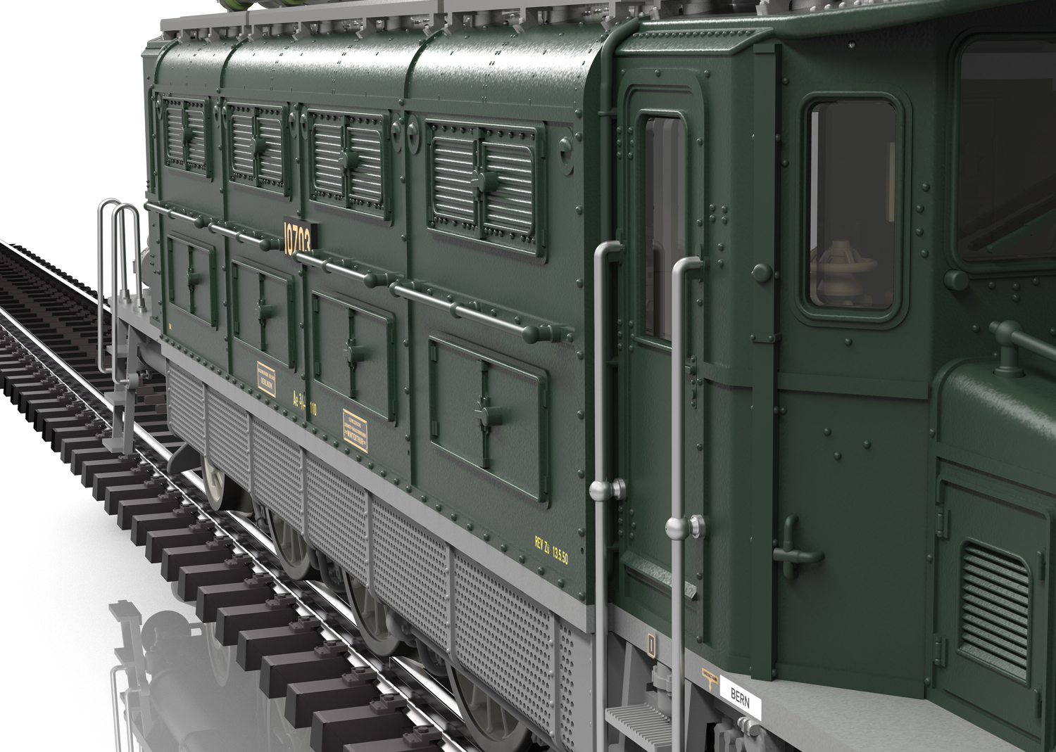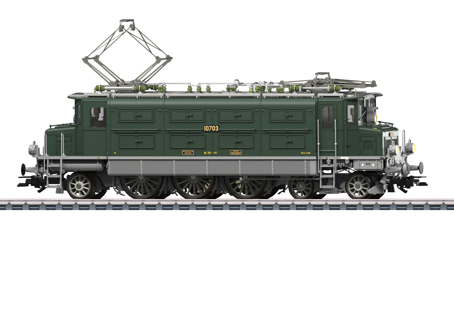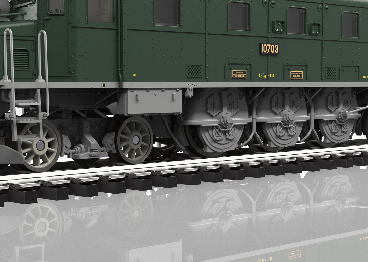 Vorbild: Elektrolokomotive Ae 3/6 I der Schweizerischen Bundesbahnen (SBB). Lokomotive aus dem achten Baulos. Tannengrüne Grundfarbgebung mit grauem Fahrwerk. Mit Stangenpuffer, stirnseitigen Übergangsblechen und 4 seitlichen Führerstandstüren. Falschfahrsignal über der jeweils oberen Lampe. Lokomotive für den Einsatz vor Leichtschnellzügen im Flachland auf der Strecke Genf-Bern-Zürich. Lok-Betriebsnummer 10703. Betriebszustand Anfang der 1950er Jahre.