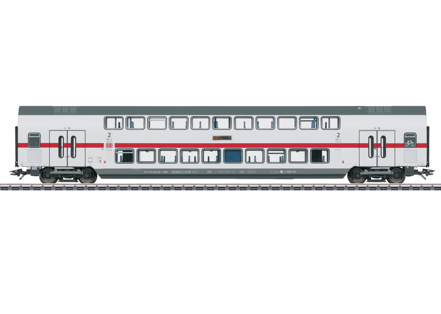 Modell: Befahrbarer Mindestradius 360 mm. Mit Hoch-Einstieg über den Drehgestellen. Serienmäßig mit eingebauter LED-Innenbeleuchtung auf beiden Ebenen und stromführenden, trennbaren Kurzkupplungen. Beleuchtete längsseitige Zugzielanzeigen. Innenbeleuchtung funktioniert nur im Verbund mit dem Doppelstock-Steuerwagen und kann über einen Decoder im Steuerwagen digital ein- und ausgeschaltet werden. Dazu ist eine definierte Fahrzeugreihenfolge vorgegeben. Stirnseitig rot transparente Schlusslicht-Einsätze an den Wagenenden. Vorbildgerechte Drehgestelle der Bauart Görlitz, mit angesetzten Klapptrittstufen. Länge über Puffer 28,6 cm.