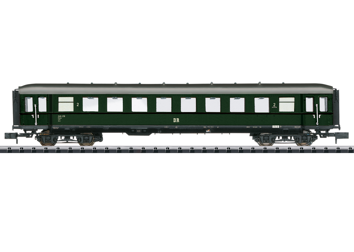 Vorbild: Eilzugwagen 2. Klasse windschnittiger Bauart B4ümpe im Zustand um 1959 der Deutschen Reichsbahn (DR) in flaschengrüner Farbgebung.