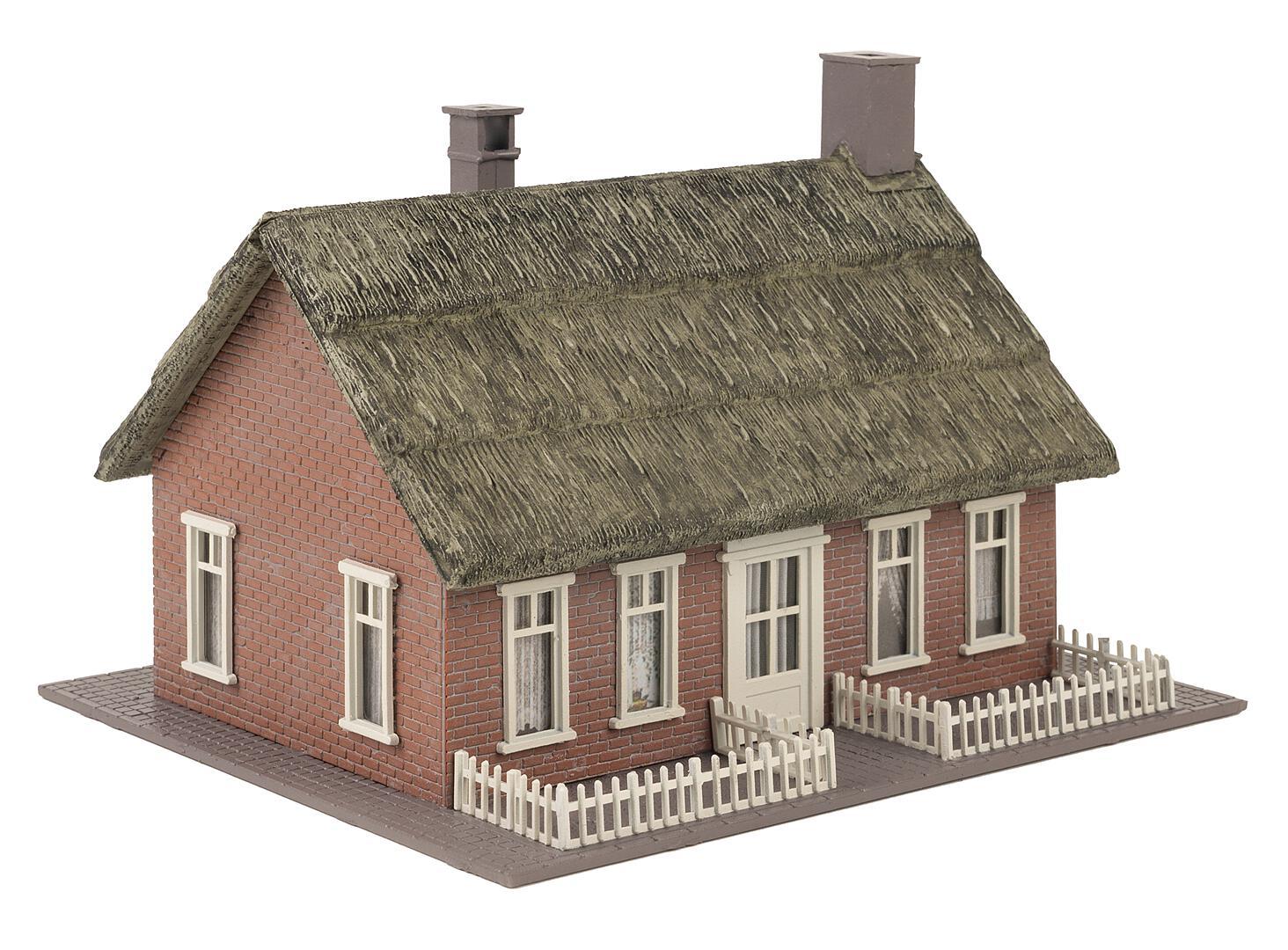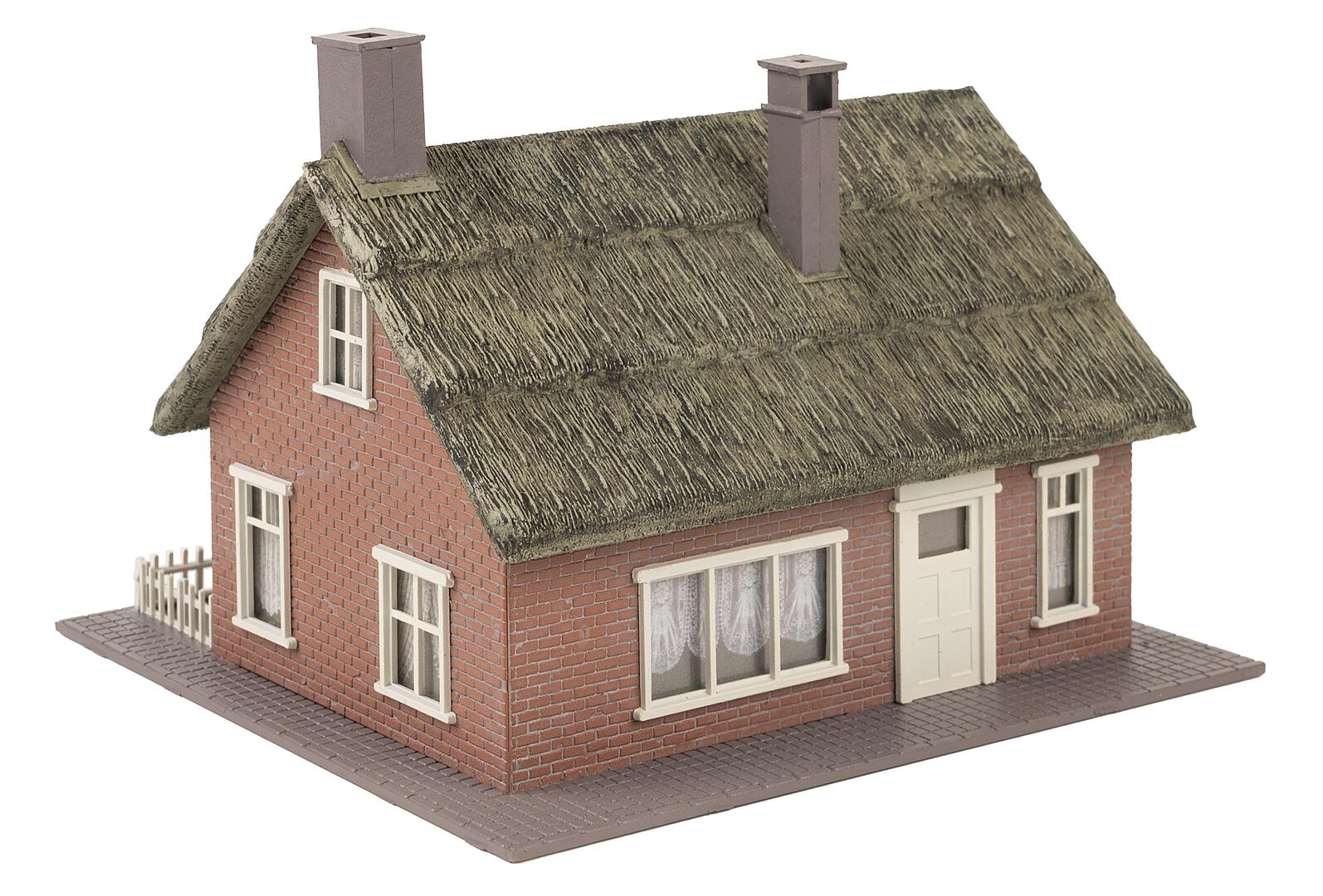Kleines und stilvolles Backsteinhäuschen mit Reetdach im norddeutschen Stil. Ein perfektes Modell für eine Modellbahnanlage oder ein kleines Diorama mit begrenztem Platzbedarf. Bausatz enthält Dieser Bausatz enthält: 28 Einzelteile in 4 Farben, Fensterfolie, 1 Gardinenmaske und 1 Bauanleitung. Verwenden Sie zum Basteln FALLER EXPERT Plastikkleber.