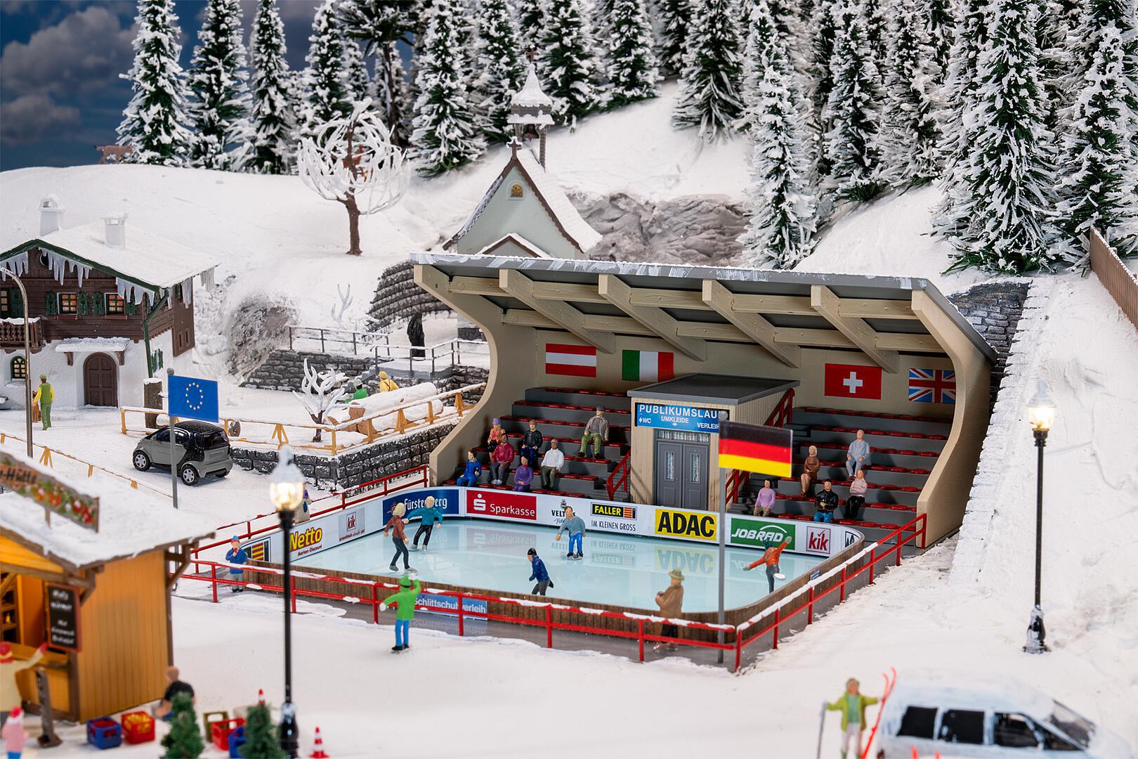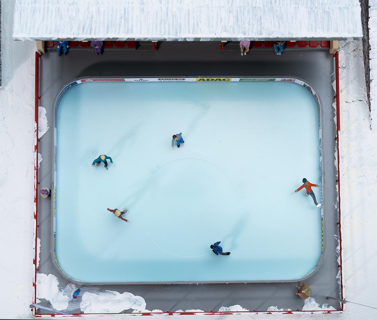 Anmutig gleiten die fünf Miniatur-Eiskunstläufer (beweglich) über die Eisfläche und hauchen dem Winter-Set Leben ein. Die Eisbahn wird von einer Tribüne mit Sitzen überragt, von der aus dem Geschehen auf der Bahn beobachtet werden kann. An den Wänden und Masten schmücken zahlreiche Länderflaggen die Szenerie. Beinahe verspürt man selbst die Lust, die Schlittschuhe anzuschnallen und mitzumachen! Inhalt: Kunsteisbahn, Eislauffiguren (5 x), Bastelmotor, welcher die Schlittschuhläufer antreibt (12-16 V, Wechselspannung)