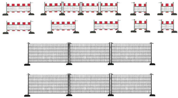zum Teil bedruckt, mit Standfüßen, zum Absperren von Baugruben und Baustellen aller Art. Hoher Absperrzaun: Gesamtlänge 240 mm. Niederer Absperrzaun: Gesamtlänge 220 mm