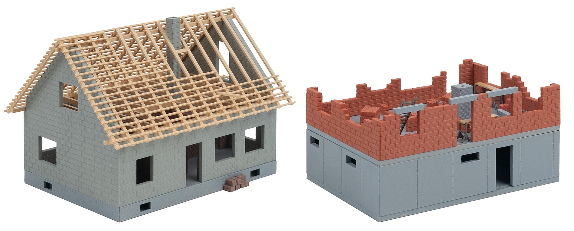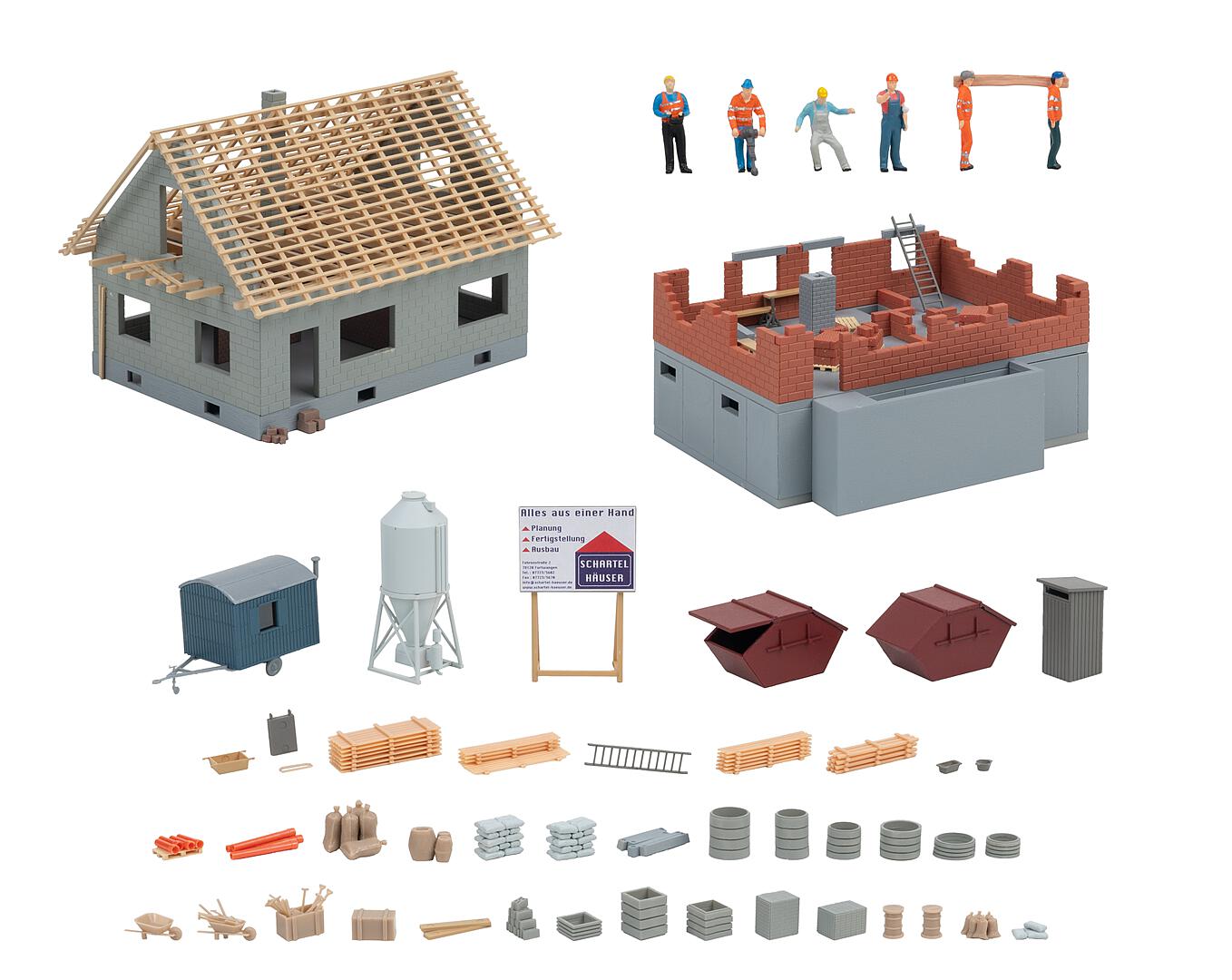Hier wird gebaut, gehämmert und gewerkelt! Zwei Häuser wachsen aus dem Boden. Eins mit frisch begonnenem Dachstuhl, das andere noch ganz im Rohbau. Ein großes Silo, ein blauer Bauwagen und jede Menge Zubehör bringen echtes Baustellenflair in die Miniaturwelt. Mit dabei: fleißige Bauarbeiter, die bohren, schrauben und das Set zum Leben erwecken! Inhalt: Einfamilienhaus im Bau, Haus im Bau, Silo, Bauwagen, 6 Figuren, Toilettenhäuschen, Container, Baustellenschild, sonstiges Zubehör (Schubkarren, Rohre, Steine, Säcke, Leitern, Werkzeuge etc.)
