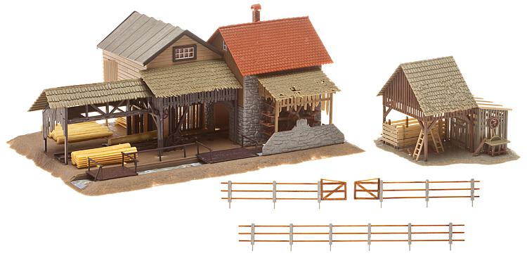 Wassergetriebenes Sägewerk mit Wohnteil, Querbau und einem Werkstatt-Schuppen. Zum Zubehör gehören Rundhölzer, Lattenstapel und ein Zaun.