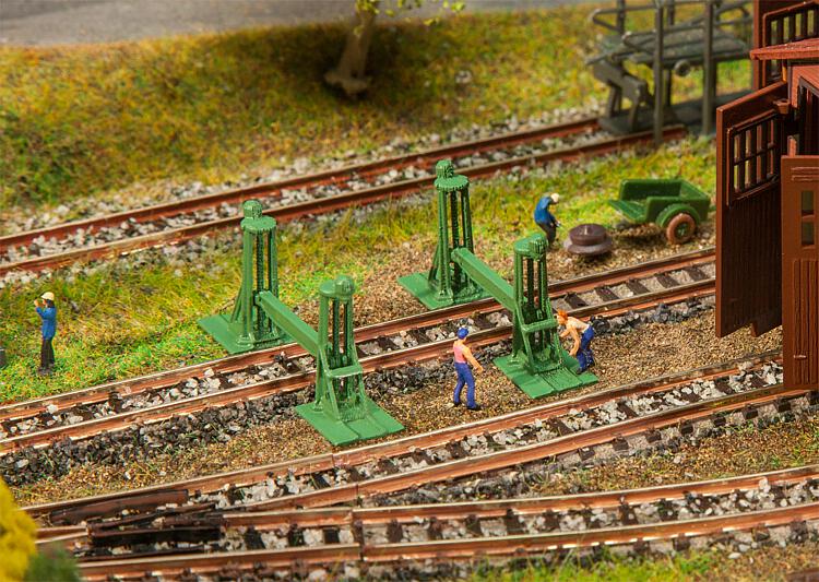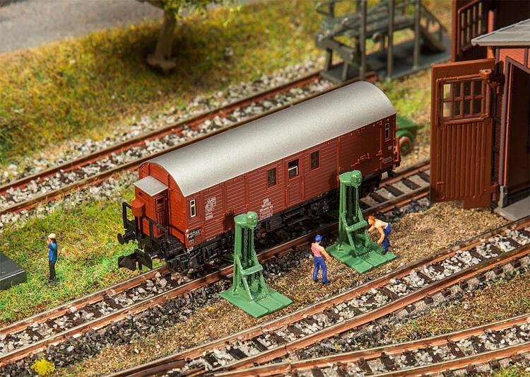 Hebeböcke mit Trägern für die Wartung und Instandsetzung der Schienenfahrzeuge in Wagenbetriebswerken. Modellausstattung für die Darstellung des Betriebs mit einem Motor. Kein Funktionsmodell.