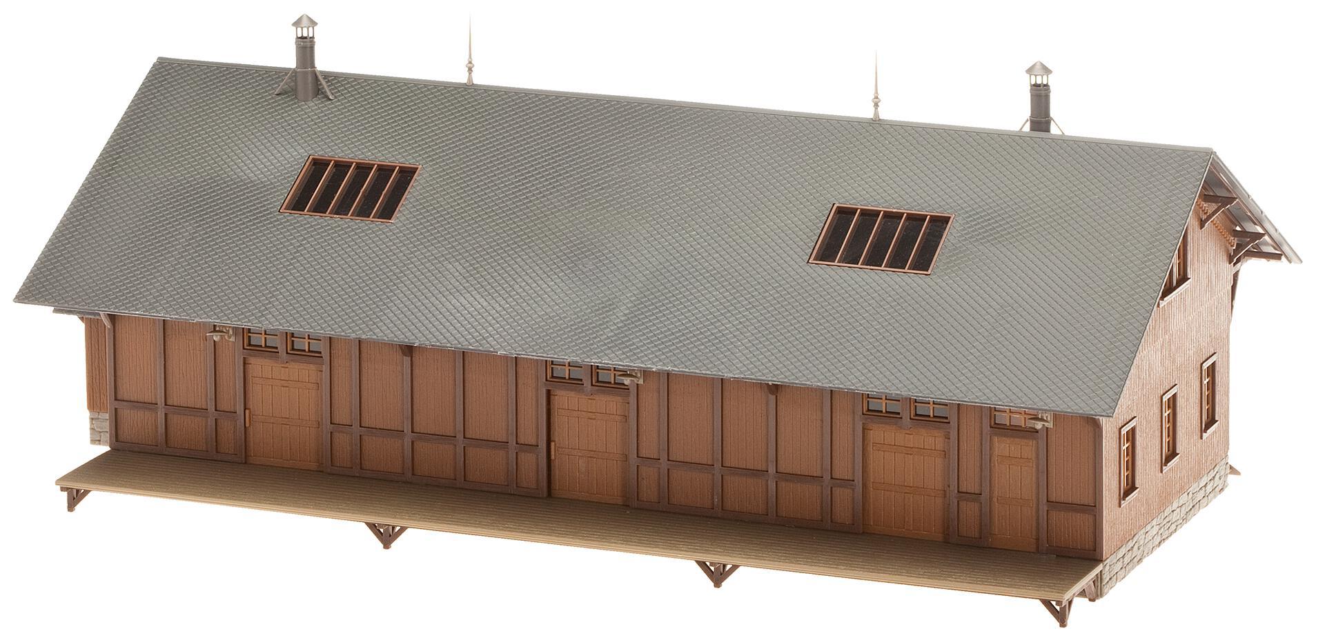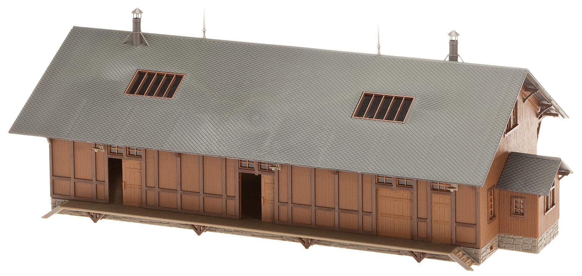 Güterschuppen in Holzbauweise mit beidseitig angebauten Laderampen, Schiebetoren und Dachoberlichtern.