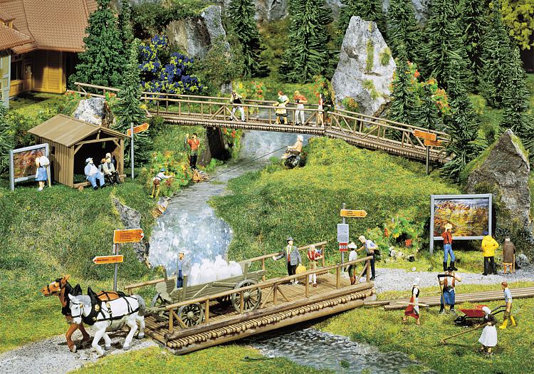 Die Packung enthält eine Wanderschutzhütte, Wanderwegschilder, eine Holzbrücke, Stege, Infotafeln – wichtige Schutz- und Orientierungselemente für den Wanderer. Dieser Bausatz enthält: 116 Einzelteile in 3 Farben, 1 Deko und 1 Bauanleitung. Verwenden Sie zum Basteln FALLER - Plastikkleber.