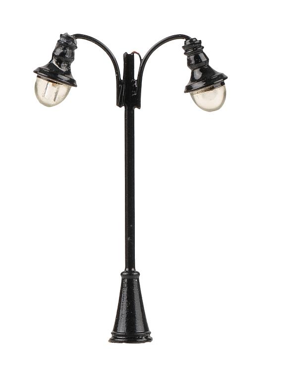 Modell einer weit verbreiteten, klassischen Leuchte. Dieses Modell zeichnet sich durch die vielseitige Verwendbarkeit aus. So eignet sie sich beispielsweise zur Beleuchtung von Altstädten, Straßen oder Industriethemen. Der Mast ist aus Metall gefertigt und die Leuchtenhöhe variabel einstellbar. Die zweiflammige Bogenleuchte ist mit langlebiger LED-Technik ausgestattet. Höhe: 60 mm.