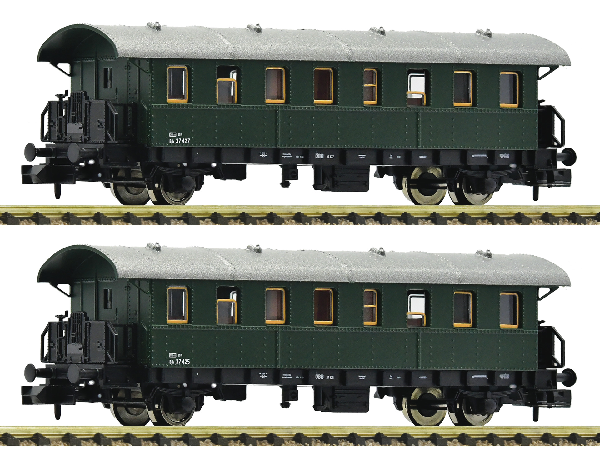 Wagenset mit zwei „Donnerbüchsen“-Personenwagen, Gattung Bih, der Österreichischen Bundesbahnen.