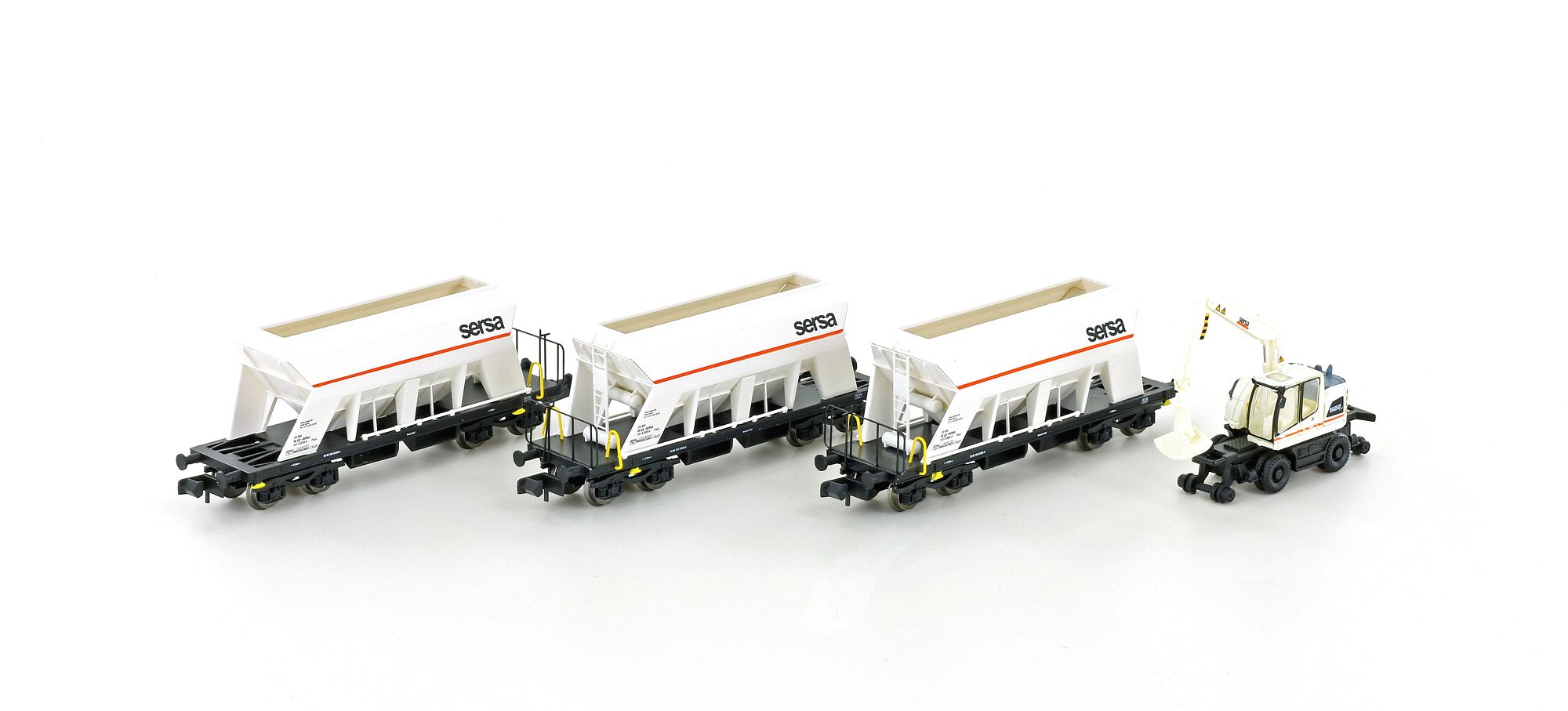 Die Selbstentladewagen zum Transport von Schotter bilden zusammen mit dem 2-Wege Bagger die perfekte Ergänzung zu unserem SERSA Bauzug mit der Vossloh G1000 (LC96001).