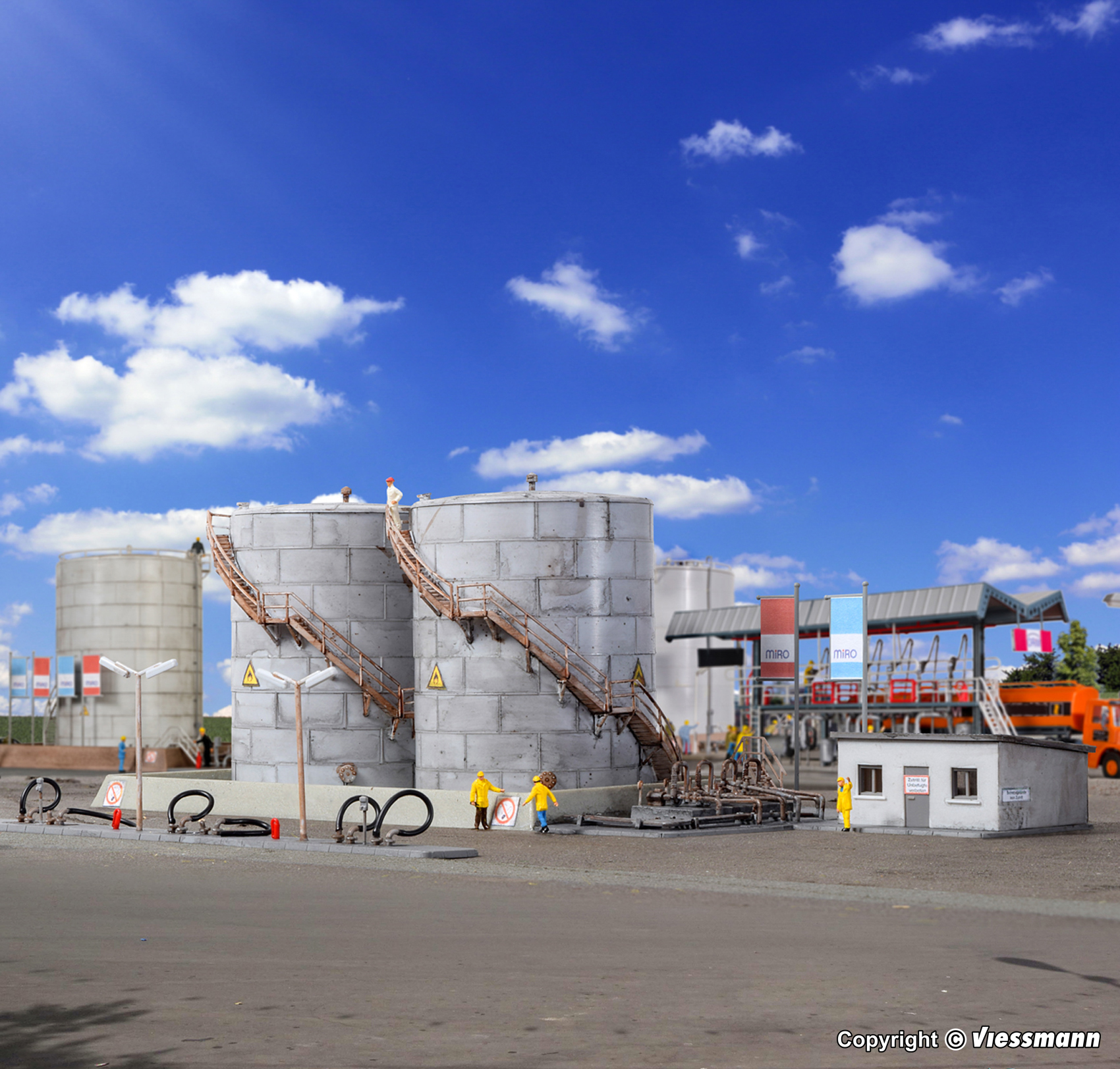 Bausatz. Die MIRO Mineralölanlage von kibri ist so konzipiert, dass sie sich aus einzelnen Bausteinen individuell zusammenstellen lässt. So lassen sich die Anlagenteile problemlos in jede beliebige Modellbahnanlage einpassen. Der angelieferte Treibstoff (z. B. Benzin oder Rohöl) wird zur Zwischenlagerung in diesem Hochtank Art. 37467 gelagert, bevor er an der Abfüllanlage Tankwagen gefüllt und von dort zu den Verbrauchern transportiert wird. Ein filigran umlaufender Treppenaufgang führt zur oberen Plattform.