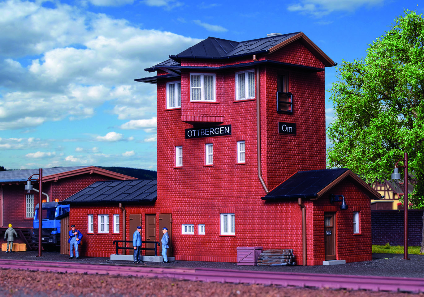 Bausatz. Das Vorbild für das kibri-Gebäude ist das Behelfsstellwerk Ottbergen Mitte (Om). Es regelte innerhalb seines Aufgabenbereiches zusätzlich den Schienenverkehr des Bahnbetriebswerkes. Umbauten an der Gleisanlage des BWs machten in den 60er Jahren das Stellwerk überflüssig. Das Gebäude aus Ziegelsteinen mit seinem turmartigen Mitteltrakt blieb bis zum Abbruch 1982 erhalten. Dazu passt der dreiständige Ringlokschuppen Art. 39452 und die Drehscheibe Art. 39456. Mit Stecksystem. Maße: L 23,5 x B 9,5 x H 13 cm. Schwierigkeitsgrad: 2 (Fortgeschrittene).