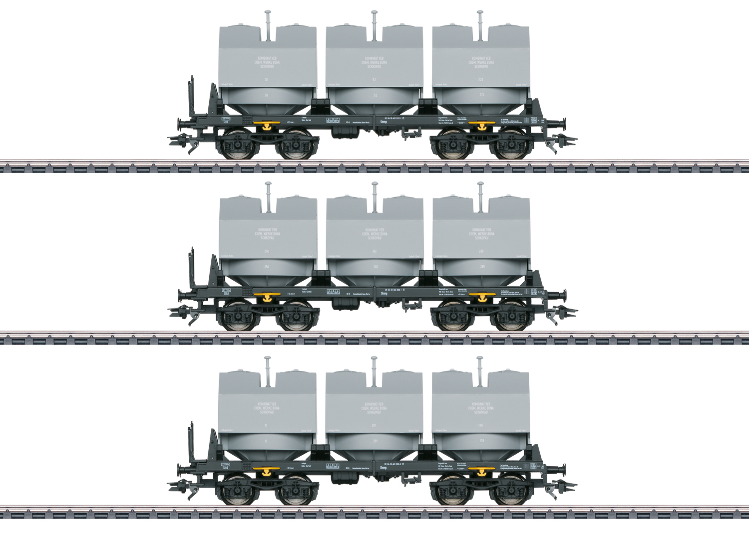 Vorbild: Drei vierachsige Kalkkübelwagen der Bauart Slmmp zum Transport nässeempfindlicher Schüttgüter. Schwarze Fahrwerke mit hellgrauen Kübeln. Privatwagen der VEB Chemische Werke Buna, Schkopau, eingestellt bei der Deutschen Reichsbahn der DDR (DR/DDR). Betriebszustand der Epoche IV.