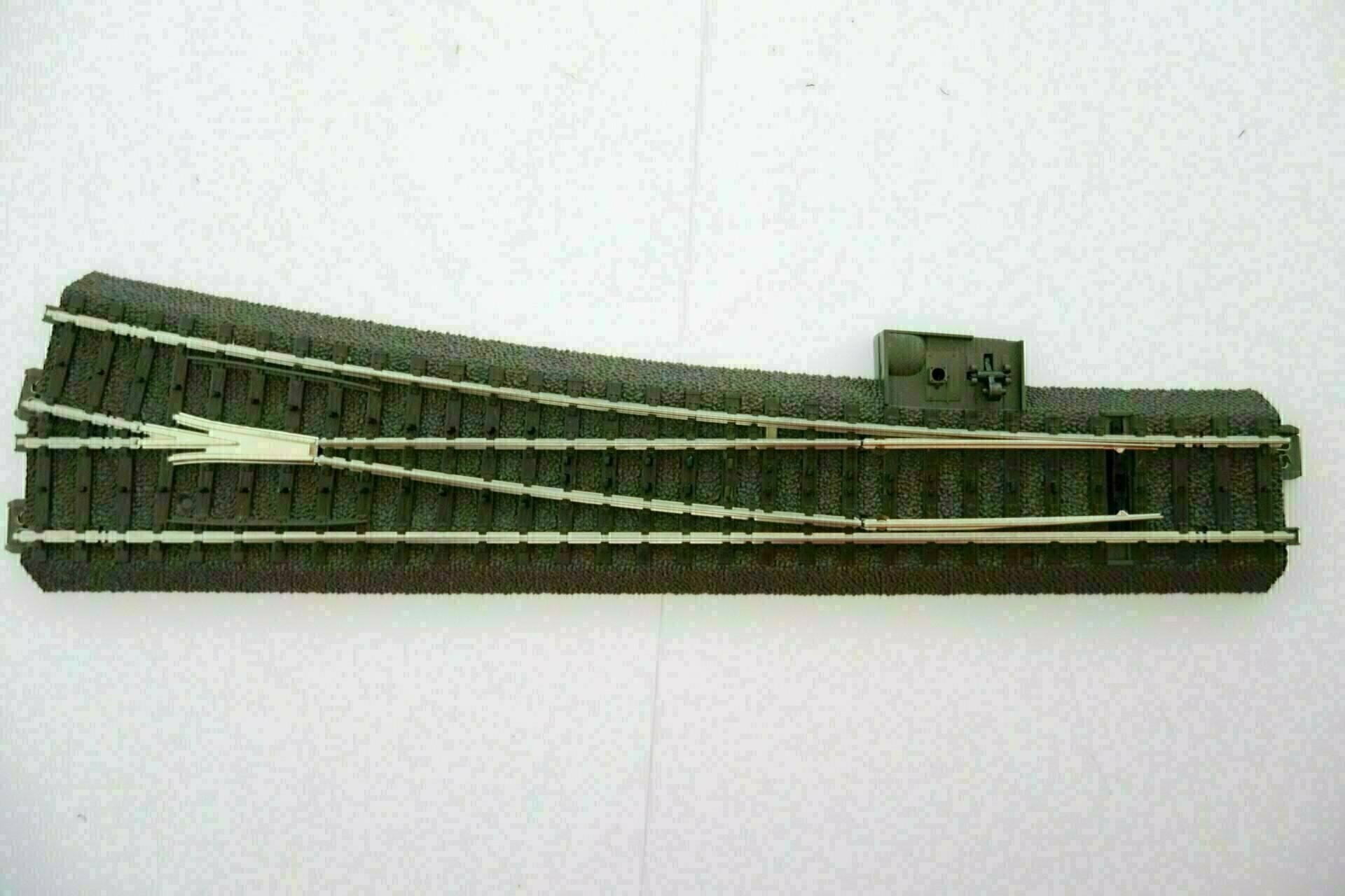 Länge 236,1 mm. Zweiggleisradius 1114,6 mm. Weichenbogen 12,1°. Herzstück 10° aus Metall. Am Ende der Weiche werden 2 Gleise 24071 benötigt, ein passendes Böschungsteil liegt bei. Mit Handschalthebel. Elektroantrieb 74491, Weichenlaterne 74470 und Digital-Decoder 74461 nachrüstbar.