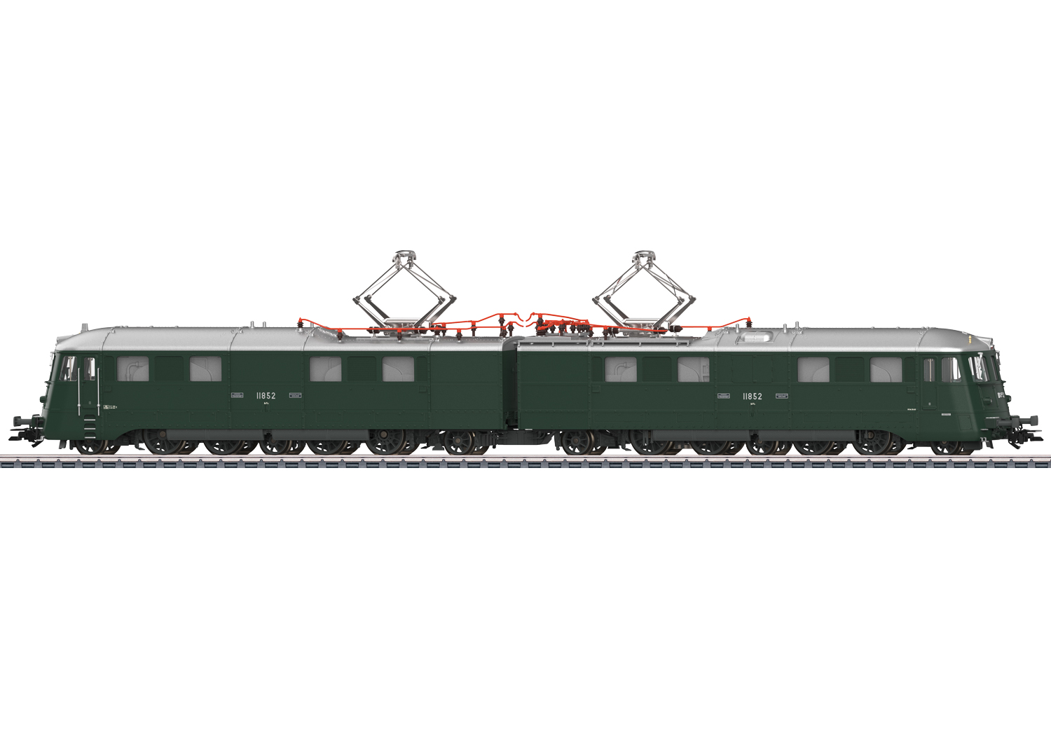 Vorbild: Schwere Doppel-Elektrolokomotive Ae 8/14 "Landilok" der Schweizerischen Bundesbahnen (SBB). Dunkelgrüne Grundfarbgebung. Ausführung mit 2 Pantographen. Hülsenpuffer mit eckigen Puffertellern. Lok-Betriebsnummer 11852. Betriebszustand Anfang der 1970er Jahre.