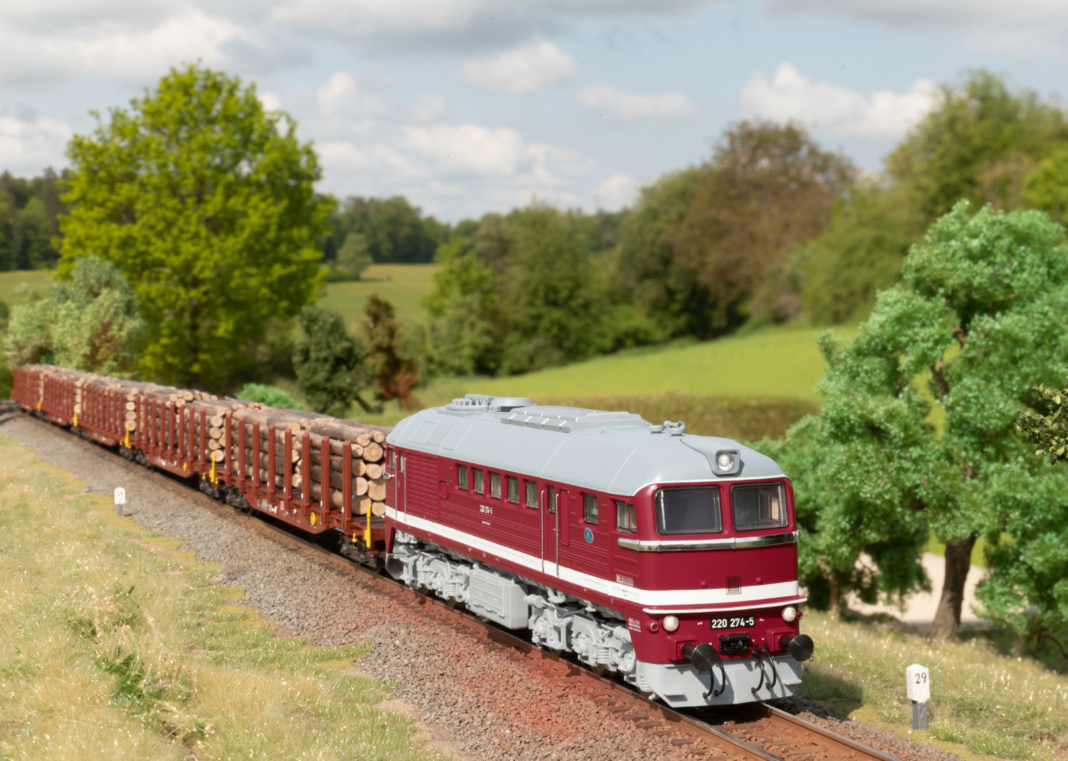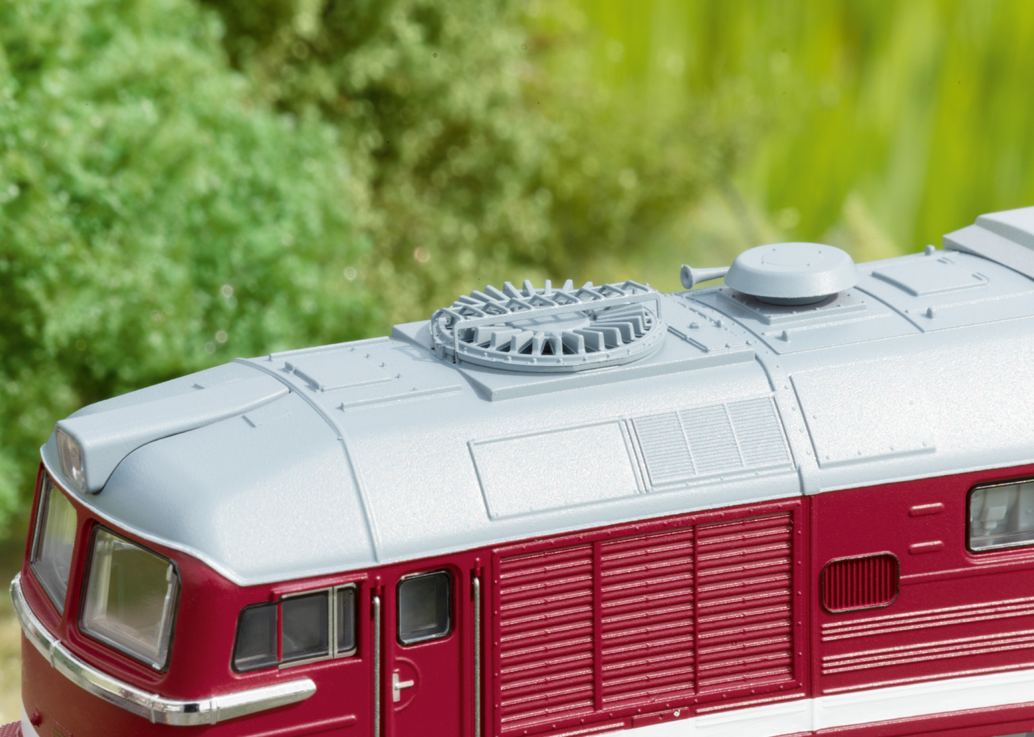 Vorbild: Diesellokomotive BR 220 der Deutschen Bahn AG (DB AG), auch bekannt unter dem Spitznamen „Taigatrommel“. Mit Schalldämpfer sowjetischer Bauart, Ansauggitter mit senkrechten Lamellen und Kühlerlüfter mit Flatterlamellen. Betriebszustand 1994. Betriebsnummer 220 274.