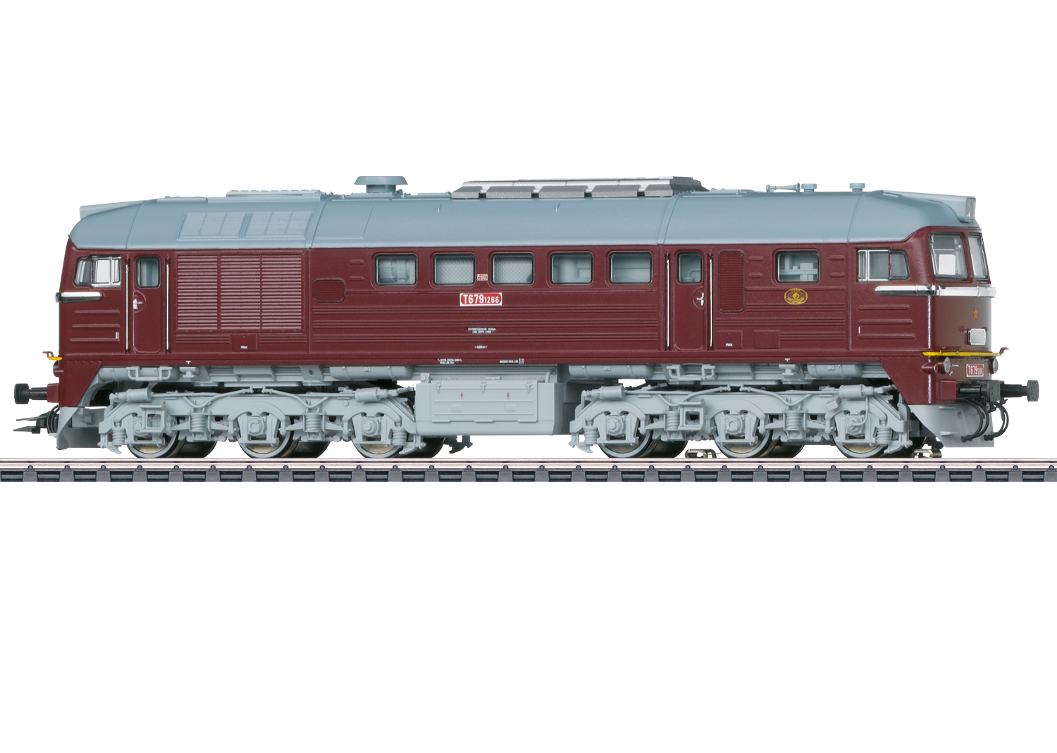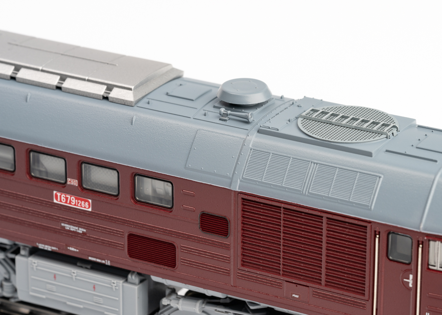 Vorbild: Diesellokomotive T 679.1266 der Tschechoslowakischen Staatsbahnen CSD, auch bekannt unter dem Spitznamen „Taigatrommel“. Mit Schalldämpfer sowjetischer Bauart, Ansauggitter mit waagerechten Lamellen und Kühlerlüfter mit Gitter. Betriebszustand um 1980.