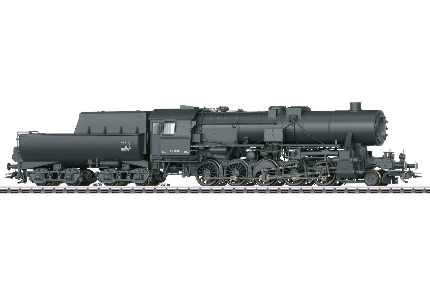Vorbild: Schwere Güterzug-Dampflokomotive Baureihe 52 mit Wannentender 2´2´T30. Deutsche Reichsbahn (DR). Schwarzgraue Grundfarbgebung. Ohne Windleitbleche. Mit Frostschutz-Verkleidung der Luftpumpe und verkleidete Schmierleitungen. Vorlauf-Radsatz mit Vollrädern. Lok-Betriebsnummer 52 1400. Betriebszustand um 1943/44.