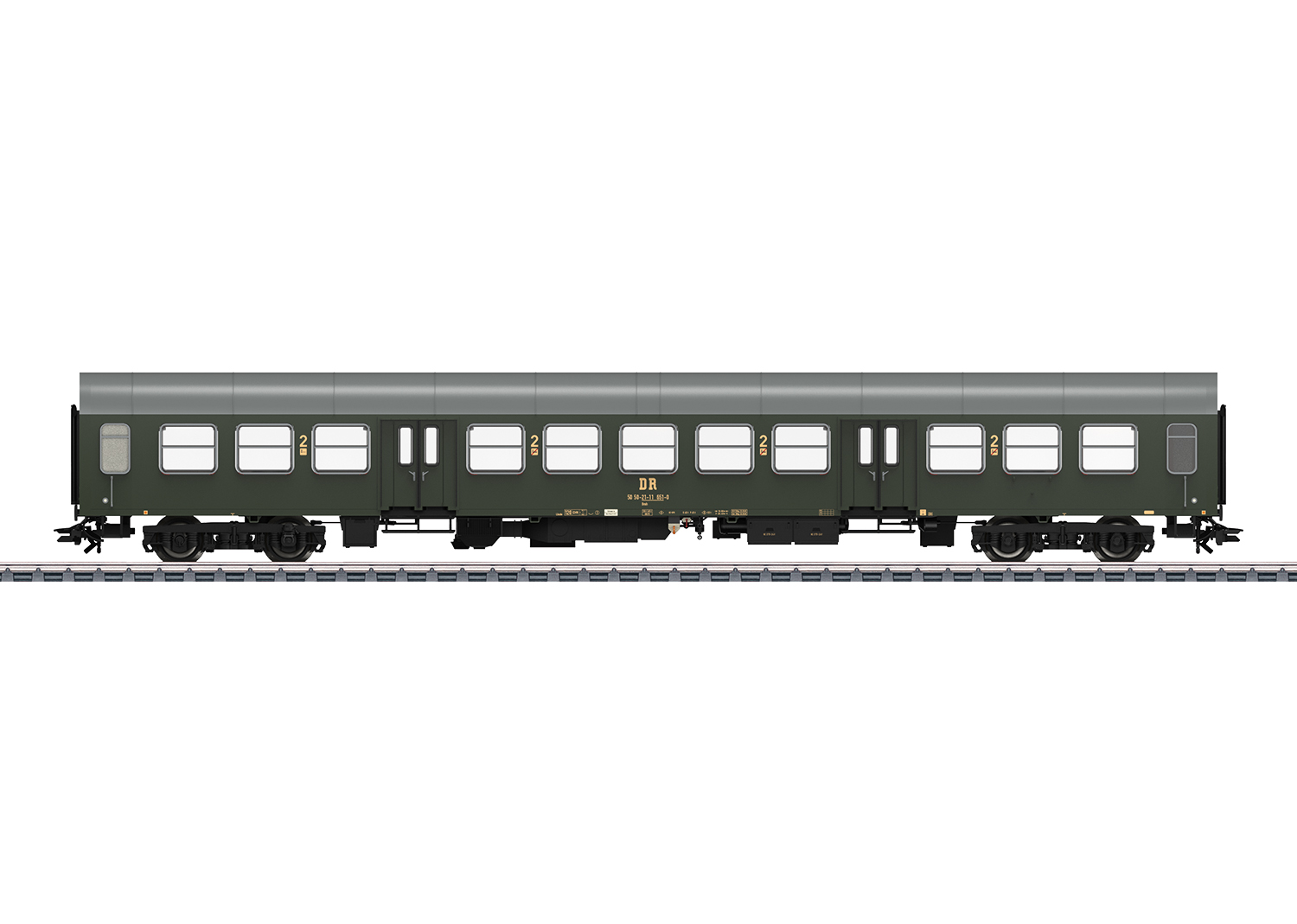 Vorbild: Personenwagen Bauart Bmh, 2. Klasse, der Deutschen Reichsbahn (DR/DDR). Bauart "Halberstädter Mitteleinstiegswagen" in dunkelgrüner (TGL 2233) Grundfarbgebung. Betriebszustand Ende der 1980er-Jahre.
