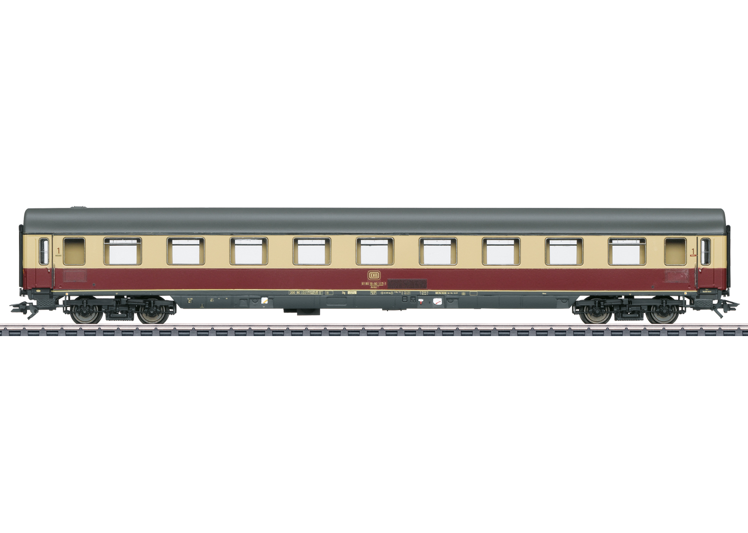 Vorbild: Schnellzug-Abteilwagen Bauart Avmz 111, 1. Klasse der Deutschen Bundesbahn (DB). Purpurrot/Beige Grundfarbgebung. Betriebszustand ab 1980.