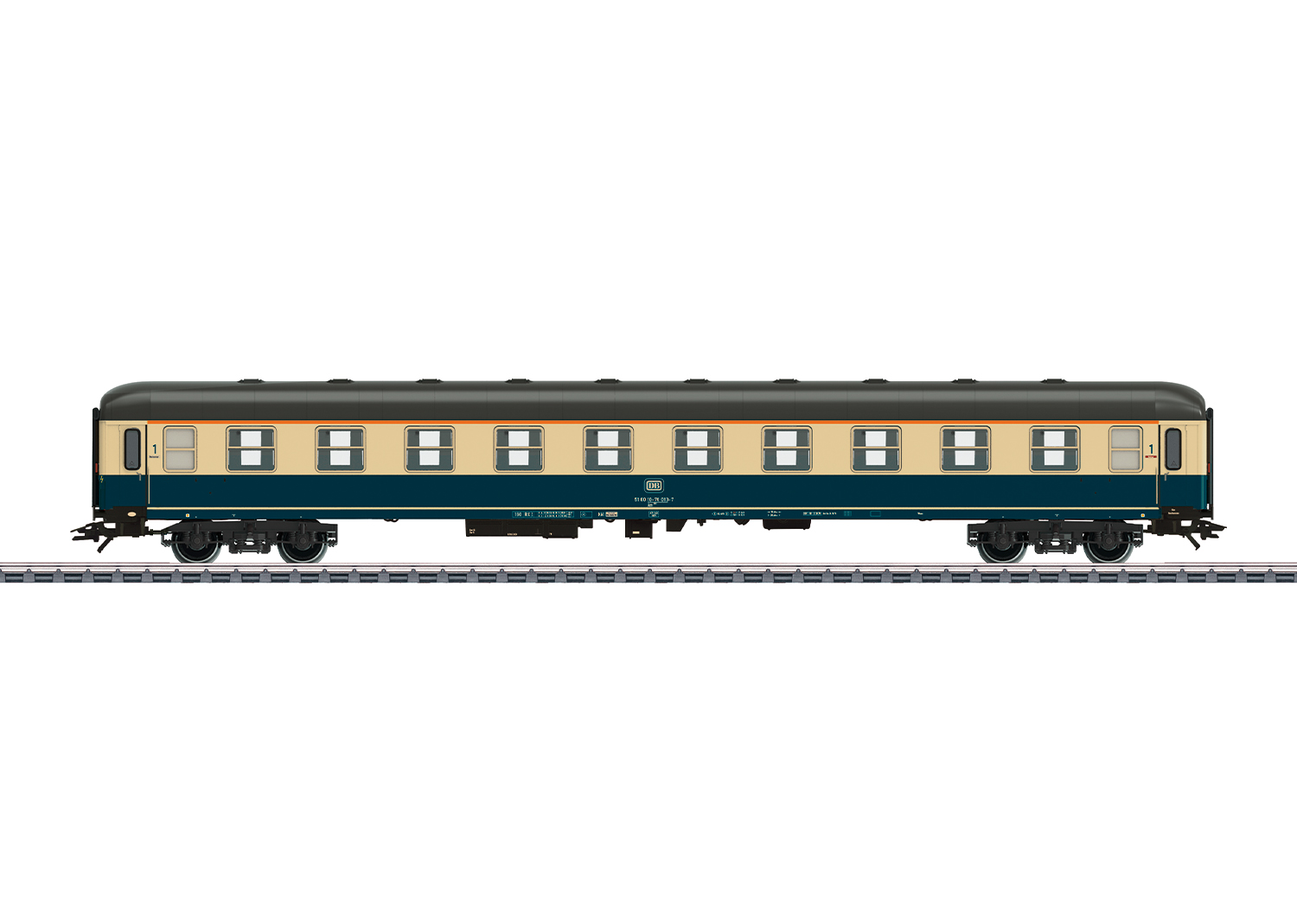 Vorbild: Schnellzugwagen Bauart Am 203, 1. Klasse der Deutschen Bundesbahn (DB). Ozeanblau/Elfenbeinfarbene Grundfarbgebung. Betriebszustand um 1980.