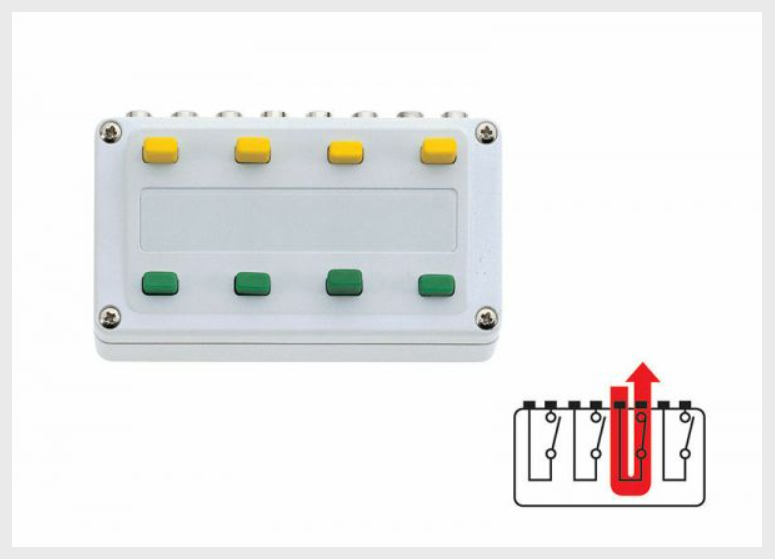 Zum Ein- oder Ausschalten von 4 verschiedenen Bahn- oder Lichtstromkreisen. Beispielsweise können 4 Abstellgleise in verschiedenen Fahrstromkreisen geschaltet werden. Mit 8 rückseitigen Anschlussbuchsen. Alle Anschlüsse für neue Stecker aus dem Set 71400. 8 passende Stecker liegen bei. Abmessungen 80 x 40 mm.