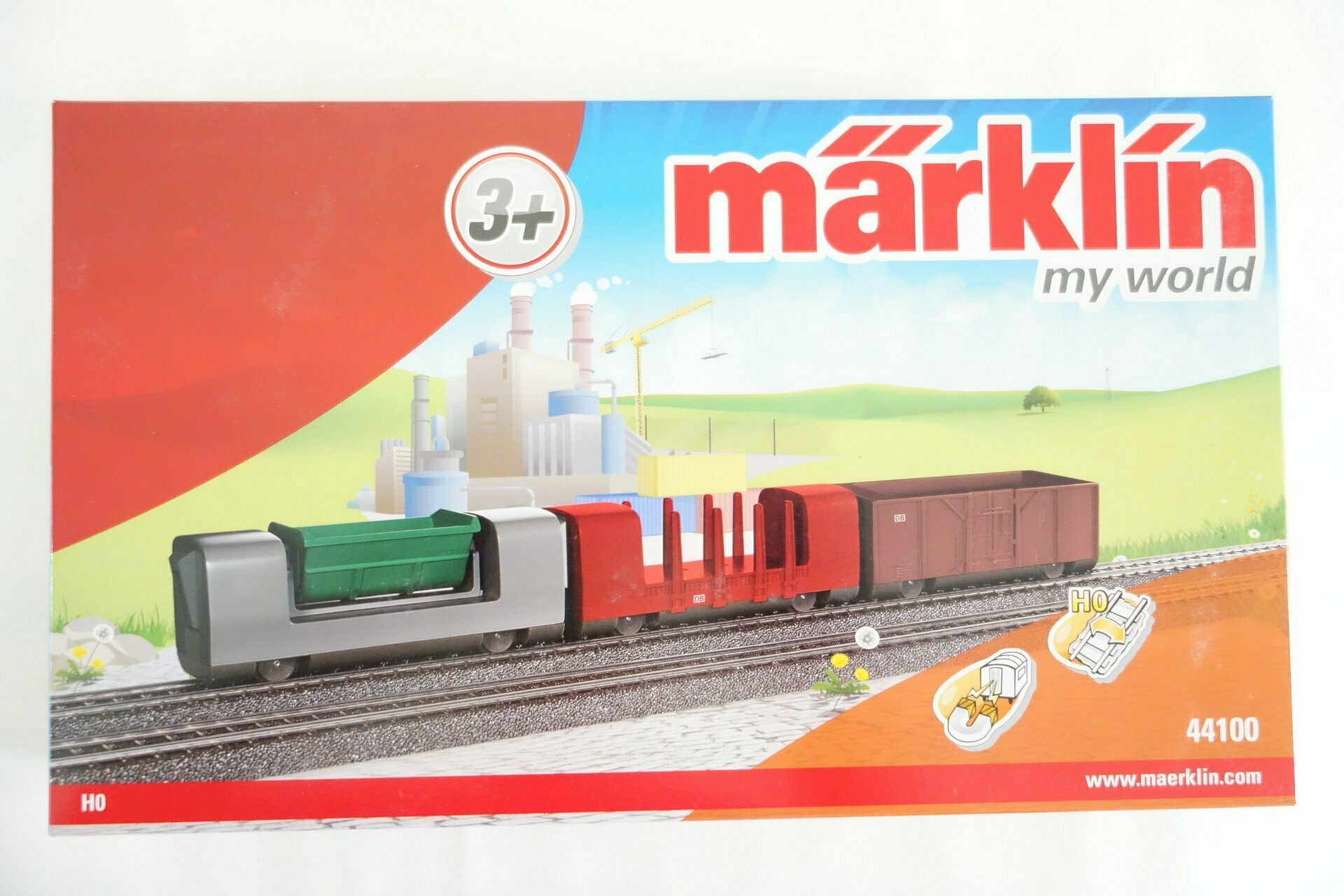 Modell: Alle Wagen mit Magnetkupplungen. Mulde des Kippwagens zu beiden Seiten kippbar. Pakete und Säcke zur Beladung der Wagen liegen bei. Gesamtlänge der Wagen 33,6 cm.