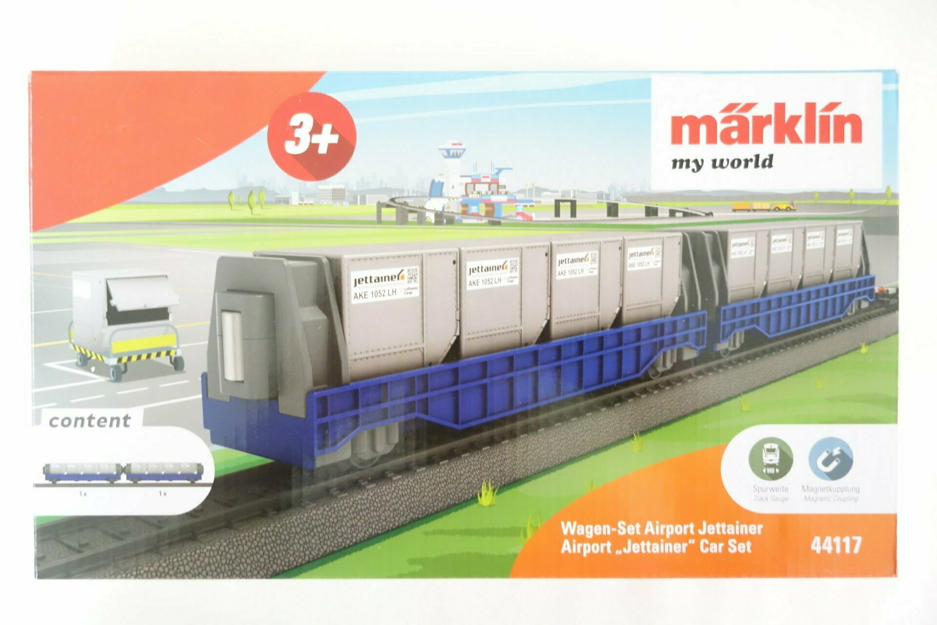 Modell: Containertragwagen mit Magnetkupplungen. Die kindgerechten, stabilen Jettainer können geöffnet und beladen werden. Die Jettainer können über das Verladeband am Airport Gebäude 72216, aus der Themenwelt Airport, spielerisch verladen werden. Gesamtlänge der Wagen 33,6 cm.