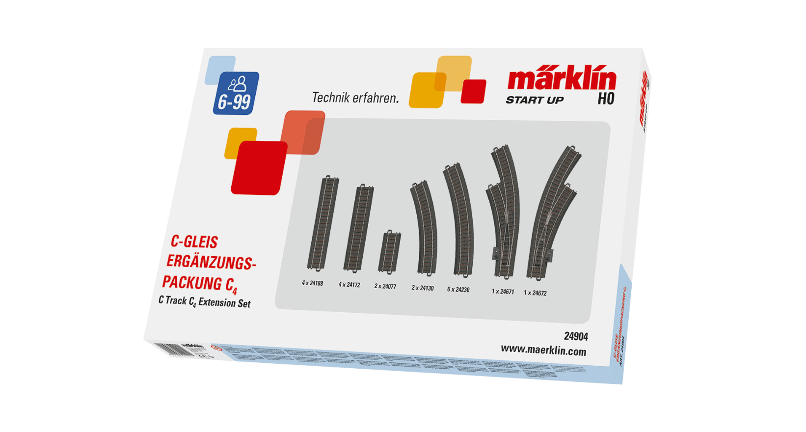 Inhalt: 4 gerade Gleise 24188, 4 gerade Gleise 24172, 2 gerade Gleise 24077, 2 gebogene Gleise 24130, 6 gebogene Gleise 24230, 1 Bogenweiche 24671, 1 Bogenweiche 24672 und Aufbauanleitung.