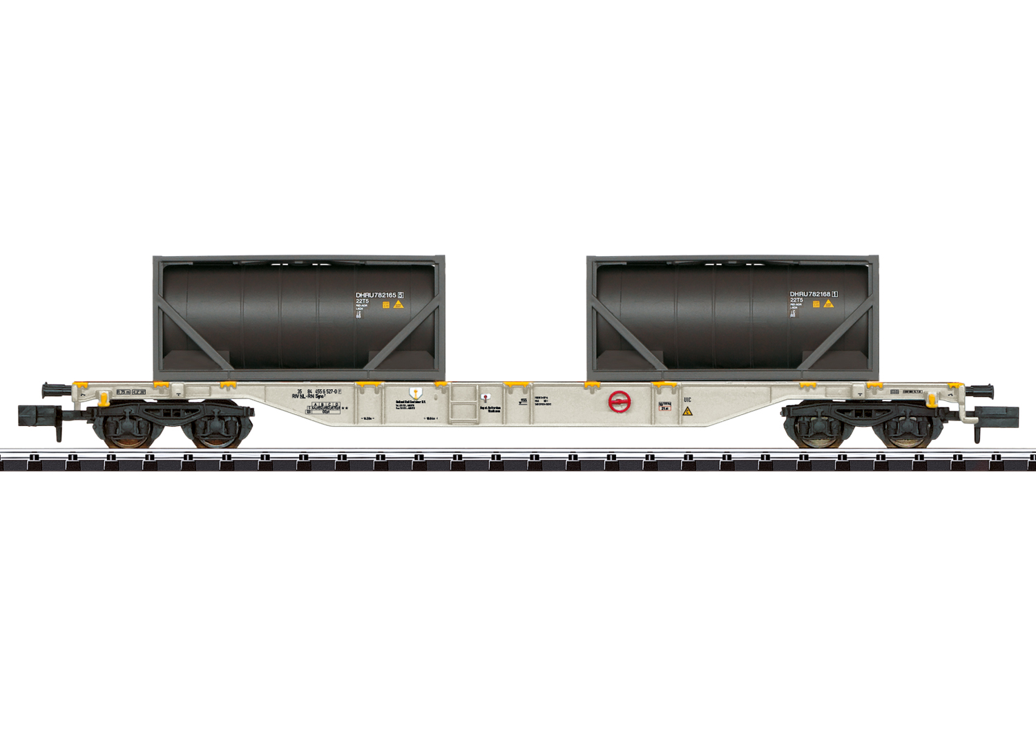 Modell: Fahrgestell aus Metalldruckguss, Drehgestelle Typ Y 25, mit Kinematik für Kurzkupplung, beladen mit 3 Tank-Containern. Länge über Puffer 123 mm.