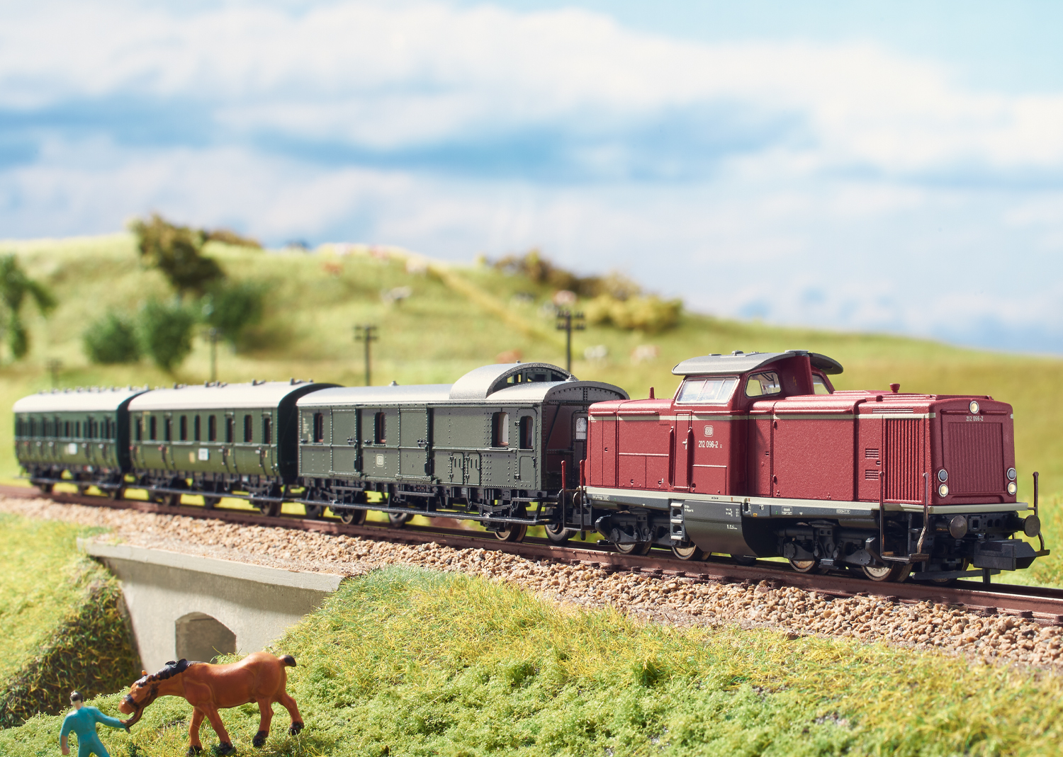 Vorbild: Diesellokomotive V 100 2027 der Deutschen Bundesbahn (DB). Ausführung in Purpurrot der Epoche III. Einsatz: Personen- und Güterzüge.