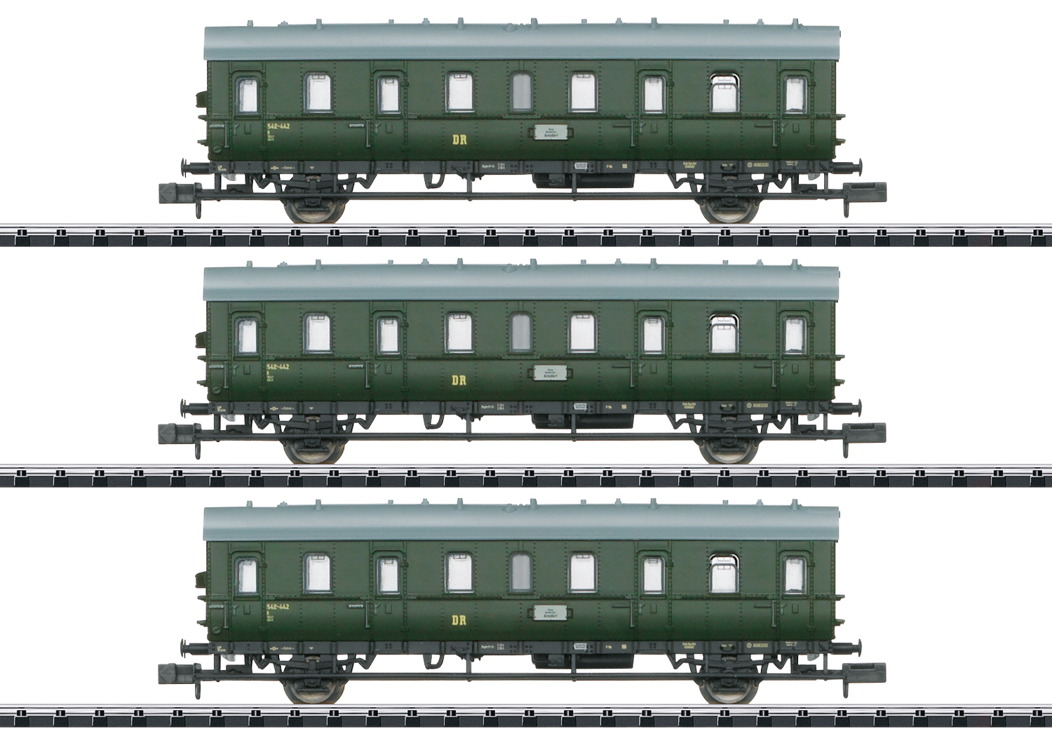 Vorbild: 3 Reisezugwagen 2. Klasse in der Ausführung der Deutschen Reichsbahn der DDR (DR/DDR). 2 Wagen DR B 541 und ein Wagen DR Btr-541 (ehemalige Cd-21b/33) für Reisende mit Traglasten. Betriebszustand um 1964.
