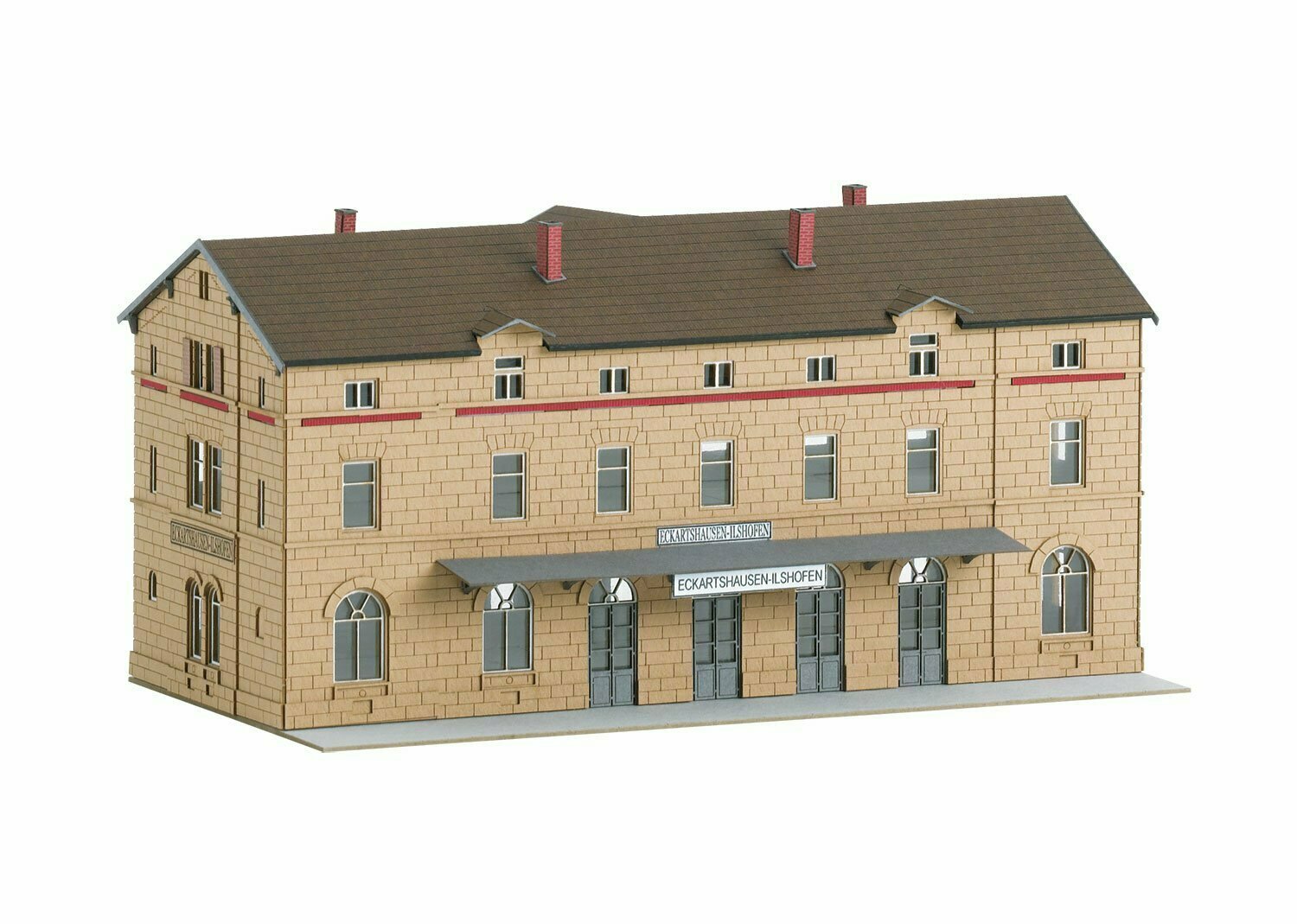 Bausatz Bahnhof "Eckartshausen-Ilshofen". Württembergischer Einheitsbahnhof in Sandstein-Bauweise. Aus diesem Bausatz lassen sich weitere nahezu vorbildgerechte Bahnhöfe gemäß der Bauanleitung herstellen: Sulzdorf, Bretzfeld, Renningen. Es liegen folgende Bahnhofsschilder (auch für Bahnhöfe, wo dieser Bausatz als Basis dienen könnte) bei: Eckartshausen-Ilshofen, Sulzdorf, Bretzfeld, Renningen, Ditzingen, Fellbach, Willsbach, Neuenstein, Waldenburg, Wasseralfingen, Weinsberg, Lorch und Rottenburg. Bausatz aus durchgefärbtem Architektur-Hartkarton, lasergeschnitten. Ausgestattet mit feinsten, lasergravierten Details. Ausführliche Bauanleitung. Maße Bahnhof Eckartshausen-Ilshofen (Grundfläche): 152 x 61 mm.