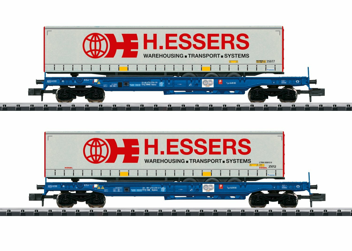 Vorbild: 2 verschiedene Einheitstaschenwagen Sdkmms der TRW. Beladen mit Sattelaufliegern der Speditionen H. Essers aus Belgien.