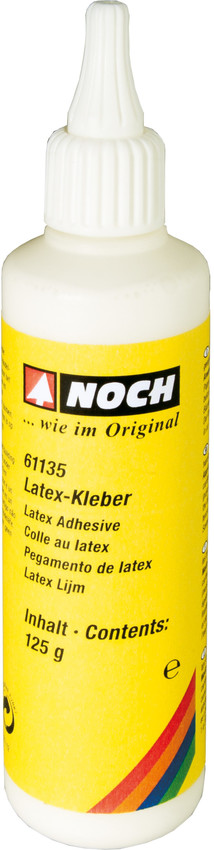 NOCH Latex-Kleber ist ein viskoser Klebstoff mit einem breiten Anwendungsbereich. Die milchig-weiße Klebe-Emulsion kann direkt aus der Flasche, mit einem Pinsel oder Spachtelmesser auf Kork, Holz, Gummi, Filz, Karton und Textilien aufgetragen werden. Der Latex-Kleber ist ideal zum Verkleben der NOCH Kork-Gleisbettungen geeignet. Der schadstofffreie Kleber eignet sich auch zum schalldämmenden Verkleben von Gleisen mit der Trasse. Dabei kann die Schiene gleichzeitig eingeschottert werden.
