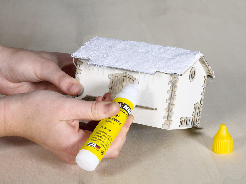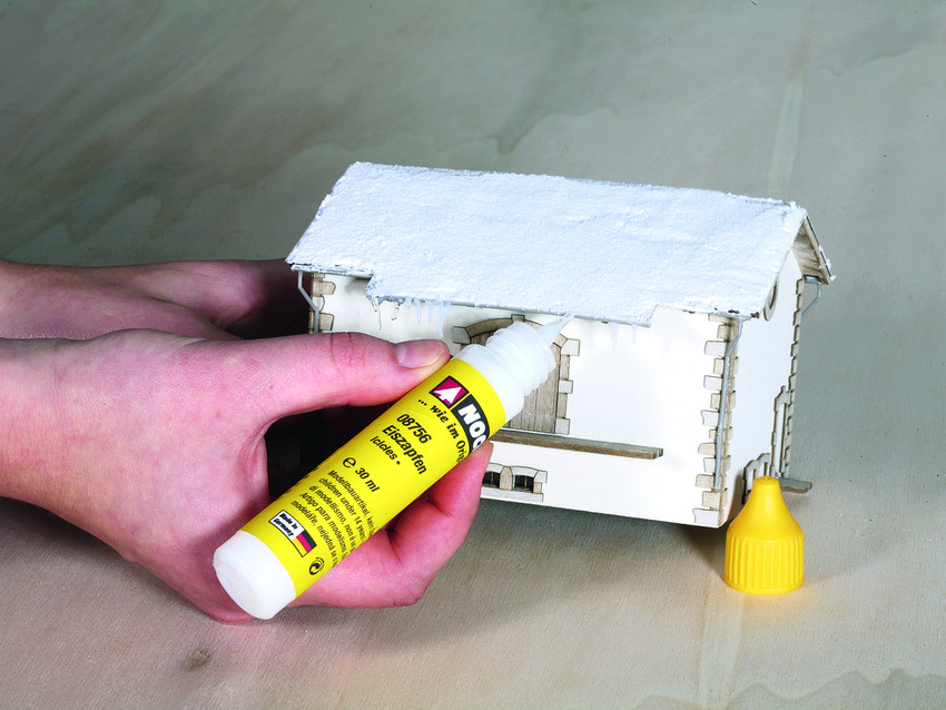 Eiszapfen aus der Tube für Advent-Deko, kreatives Weihnachtsbasteln, Miniatur-Winterlandschaften und DIY. Die Eiszapfen-Emulsion ist milchig und zähflüssig und lässt sich dadurch direkt aus der Tube zum Beispiel an einem Dachvorsprung eines Weihnachtshäuschens anbringen. Man kann aber nicht nur tolle Miniatur-Winterlandschaften damit basteln und dekorieren, denn der Kreativität sind bekanntlich keine Grenzen gesetzt. Man kann mit der Eiszapfen-Paste zum Beispiel auch Weihnachts- und Advents-Deko verzieren und dadurch individueller gestalten und aufmöbeln. Die Eiszapfen sind nach dem Austrocknen glasklar transparent und sehen aus wie echtes Eis – ein toller Effekt!