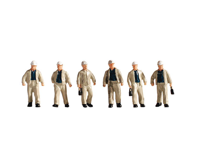 Im Bergbau beschäftigte werden als Bergmänner, Bergarbeiter, Knappen oder auch als Kumpel bezeichnet. Unser hübsches Set mit handbemalten Figuren enthält sechs Kumpel beim Schichtwechsel. Drei Kumpel sind in sauberer Arbeitskleidung auf den Weg zur Arbeit, während drei weitere Kumpel in verschmutzter Arbeitskleidung von ihrer Schicht zurückkehren. Die Modellfiguren sind in der Spur H0 (Maßstab 1:87, ca. 2 cm hoch) ausgeführt und eignet sich perfekt für die Dekoration von Modellszenen.