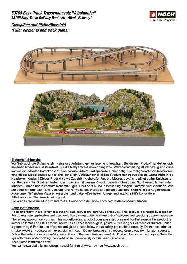 Den Bau der Anlage haben wir für Sie im NOCH Ratgeber Easy-Track „Albulabahn" Schritt für Schritt in Text und Bild dargestellt. Jedem Bausatz liegt ein Ratgeber bei, dieser kann aber auch separat, vor dem Start des Bauprojekts, hier im Online-Shop bestellt werden.