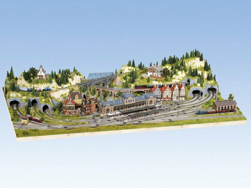 Baden-Baden ist ein besonders attraktives Großmodell mit viel Bahnbetrieb und erfüllt damit auch die Ansprüche technisch versierterer Modellbahner. Im sehr natürlich wirkenden Mittelgebirgsland liegt eine Romantische Kurstadt, deren Hauptattraktion der eindrucksvolle Bahnhof mit fünf Durchfahrgleisen und zwei Bahnsteigen ist. Daran angeschlossen: ein Bahnbetriebswerk mit sechs Abstellgleisen und Ablaufberg. Auf der besonders großzügigen Streckenführung können ohne weiteres auch lange Züge eingesetzt werden. Sechs Tunnel, vier gestaffelte Brücken und eine Bergstrecke mit Nebenbahnhof machen einen äußerst realistischen Zugbetrieb möglich. Hinzu kommen noch ein voll funktionsfähiger Bahnübergang und ein kleiner See mit Bachlauf und Stauwehr (für fließendes Wasser geeignet).