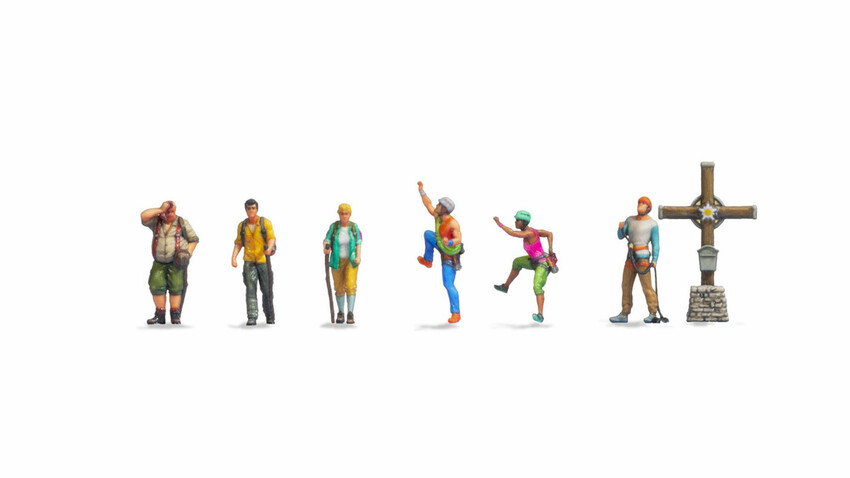 Im Set sind drei Wanderer, drei Bergsteiger und ein Gipfelkreuz enthalten. Die Wanderer sind mit Wanderstock und Rucksack ausgestattet, die Bergsteiger sind hingegen mit Klettergurt, Helm und Kletterseil auf dem Gipfel unterwegs. Das im Set enthaltene Gipfelkreuz lässt jede Bergspitze noch realistischer erscheinen ...wie im Original!