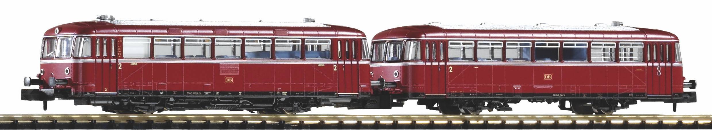 Druckvariante des DB Schienenbusses der Epoche III. Die PIKO Modelle des Trieb- und des Steuerwagens verkörpern, wie ihre DB Vorbilder, funktionssichere Konstruktionen. Das Triebwagenmodell wird von einem Kleinstmotor angetrieben, der zugunsten einwandfreier Laufeigenschaften mit zwei präzise dimensionierten Schwungmassen ausgestattet ist. Der Antrieb wirkt auf beide Achsen des Triebwagens. Da Trieb- und Steuerwagen über eine stromleitende Kurzkupplungskinematik miteinander kuppelbar sind, können bei Einsätzen mit Steuerwagen zwei weitere (und damit vier) Achsen zur sicheren Stromabnahme herangezogen werden. Der Triebwagen besitzt eine Digitalschnittstelle PluX16 nach NEM 658. Die Beleuchtungsfunktionen beider Fahrzeuge sind gesondert schaltbar. Ein freier Durchblick ist bei Trieb- und Steuerwagen durch die Fahrgasträume möglich. Der Triebwagen lässt sich vorbildgerecht auch als Triebfahrzeug f
