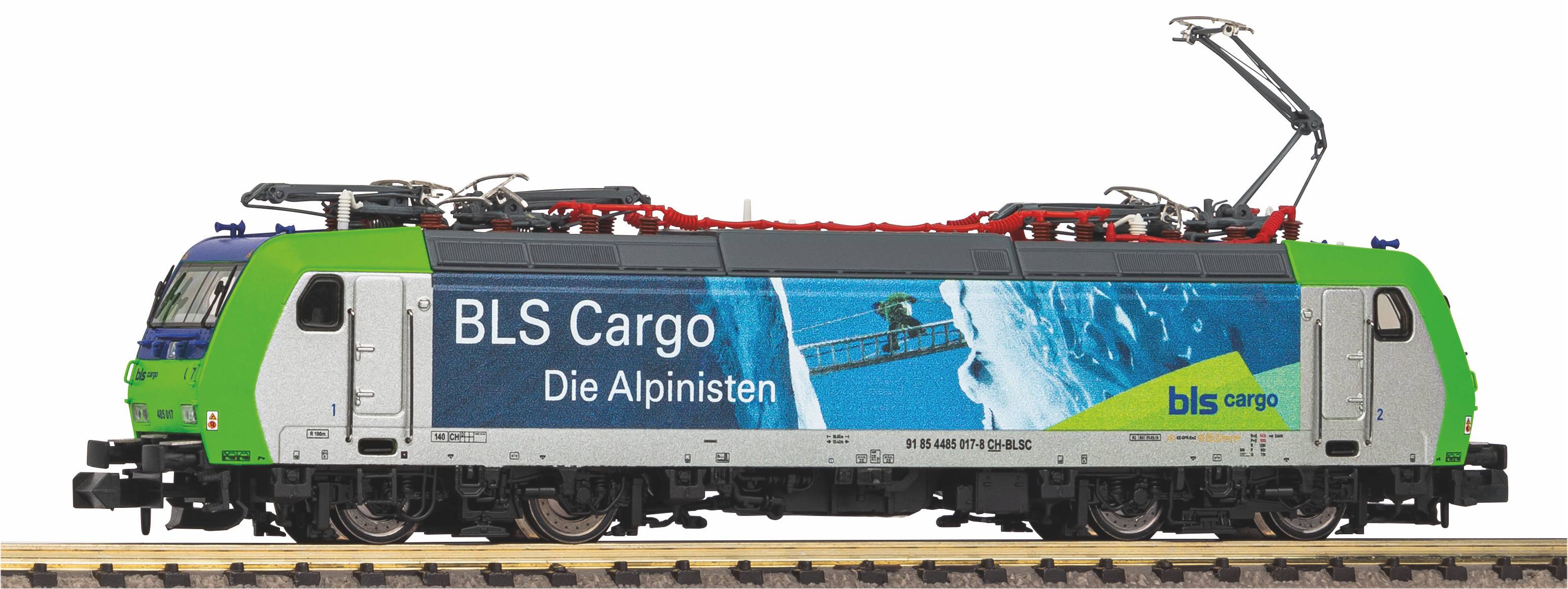 Neuheit 2024: Die Elektrolokomotive BR 185 der BLS in Epoche VI als zeitgemäßes Modell in der Spurgröße N. Die markanten Proportionen des Vorbilds wurden maßstäblich perfekt ins Modell übertragen. Die detailreich gravierten Drehgestelle, einzeln angesetzten Sandkästen, freistehenden Handgriffe und filigranen Stromabnehmer sind Zeugnis für modernen Werkzeugbau und hervorragende Fertigungstechniken. Der kraftvolle Mittelmotor sorgt mit seinen zwei feinst gewuchteten Schwungmassen für hervorragende Fahreigenschaften und hohe Traktionsleistung, die durch zwei diagonal auf den mittleren Achsen angeordnete Haftreifen noch unterstützt wird. Ab Werk verfügt das Modell über wartungsfreie LED-Beleuchtung mit fahrtrichtungsabhängigem Lichtwechsel, sowie über eine moderne Next18-Schnittstelle für den kinderleichten Einbau eines Digitaldecoders, der noch vorbildgetreueren Betrieb auf der Modellbahnanlage ermöglicht