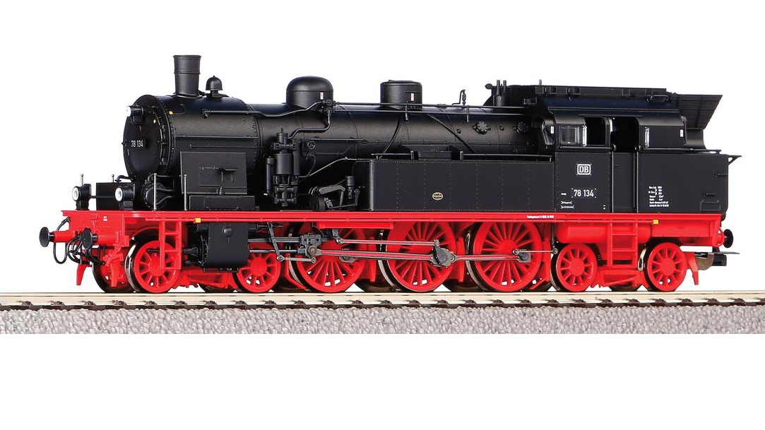 Endlich kommt eine zeitgemäße Ablösung der sehr beliebten und früher weitverbreiteten BR 78 in Form einer Neukonstruktion aus dem Hause PIKO – und mit ihr die erste Dampflok in der Produktlinie Expert. Das Modell hängt den etablierten Standard des Expert-Sortiments noch etwas höher. Nahezu alle Leitungen wurden freistehend ausgeführt, Führerhaus, Wasserkästen und Rauchkammer zieren feinste Nachbildungen der Nietköpfe. Radsatzsterne und Steuerung konnten durch die verwendeten Materialien höchst filigran ausgeführt werden. Für ausgezeichnete Fahreigenschaften sorgt der fünfpolige PIKO Motor mit Schwungmasse. Zusatzgewichte im Kessel und zwei Haftreifen sorgen für eine hohe Zugkraft. Dank der modernen PluX22-Schnittstelle ist die Nachrüstung eines Decoders kinderleicht. Ebenfalls mit minimalem Aufwand können nachträglich ein Lautsprecher und ein Rauchsatz eingebaut werden. Für authentische Betriebsstimmung sorgt die fahrtrichtungsabhängige Beleuchtung in LED-Ausführung.