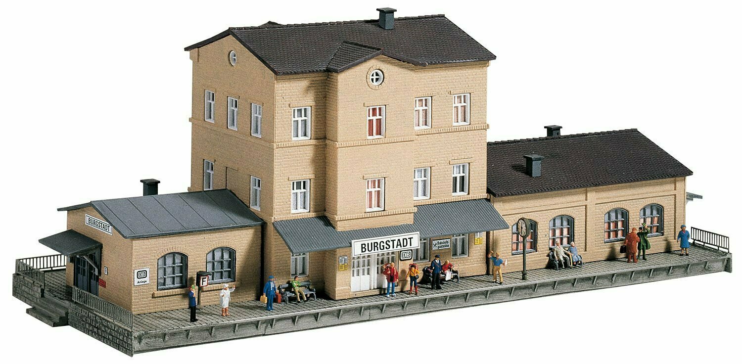 Durch die Backsteinimitation und dem 3stöckigen Mittelgebäude mit den zwei abgesetzten Anbauten kann der Bahnhof in jeder Epoche eingesetzt werden. Auch heute noch sind viele Bahnhöfe dieser Art in Betrieb. Die kleineren Gebäude beherbergen einen Güterschuppen mit Toren für die Anfahrt von Speditionen, während in den anderen Gebäuden z.B. Bahnutensilien gelagert werden können. Im Mittelgebäude befindet sich die Bahnhofshalle, die oberen Stockwerke können als Einliegerwohnungen genutzt werden. So richtig wohl fühlt sich der teilweise gealterte Bahnhof "Burgstadt" in einer mittleren bis kleinen Stadt.