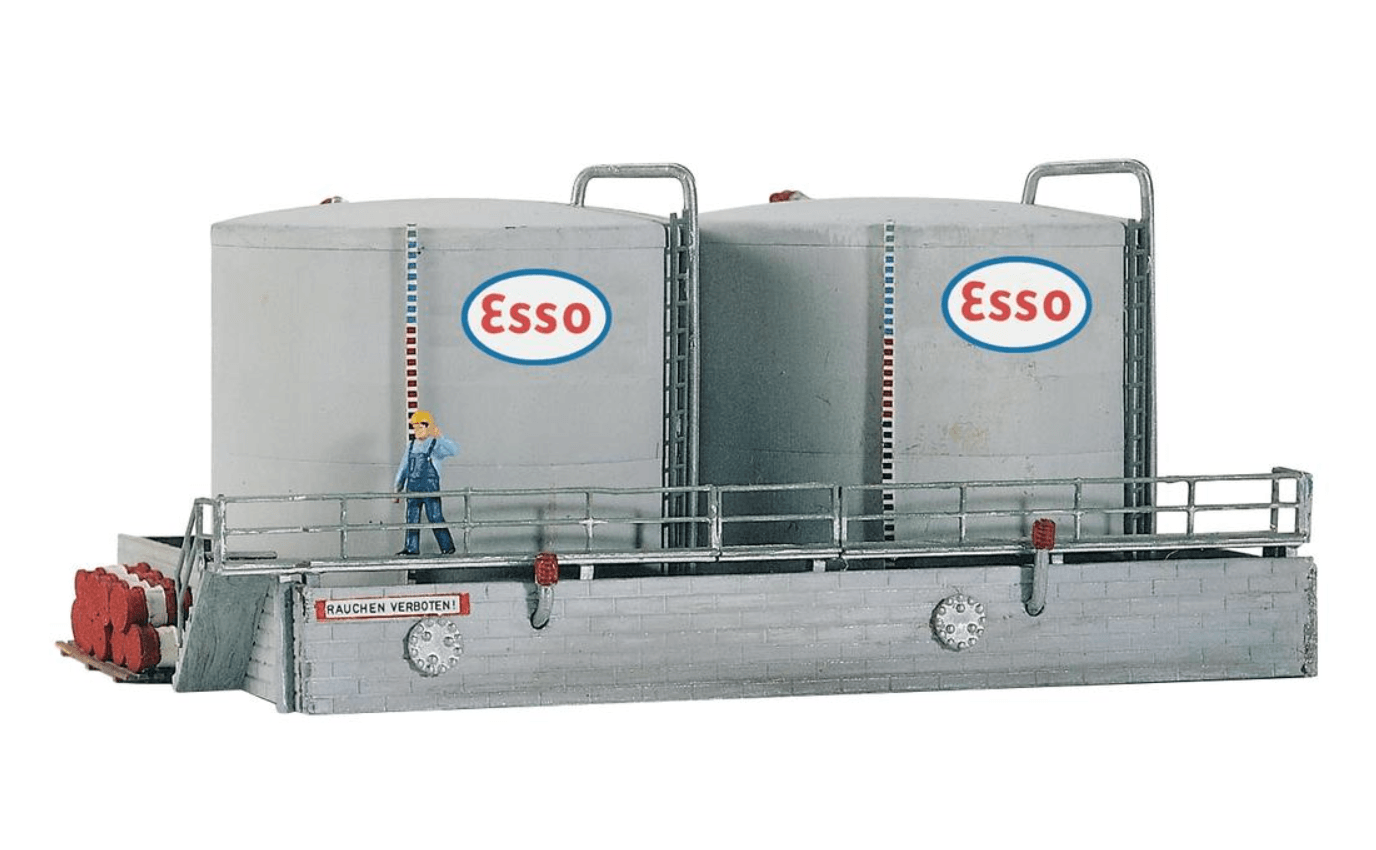 Tanklager mit zwei Vorratsbehältern zur Zwischenlagerung des mit Kesselwagen angelieferten Treibstoffes. Originalgetreue, gealterte Nachbildung der Kesselarmaturen, der Abfüllstutzen sowie der Ölauffangwanne.