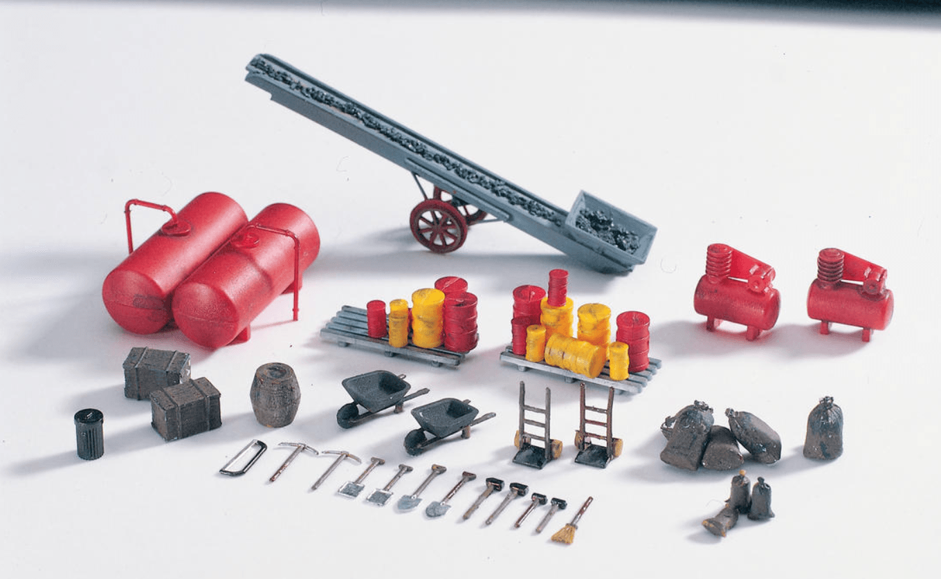 Dieser Bausatz enthält das typische Zubehör wie Förderband, Fässer, Sackkarren und Schubkarre. Dieser Zurüstsatz läßt keine Wünsche offen.