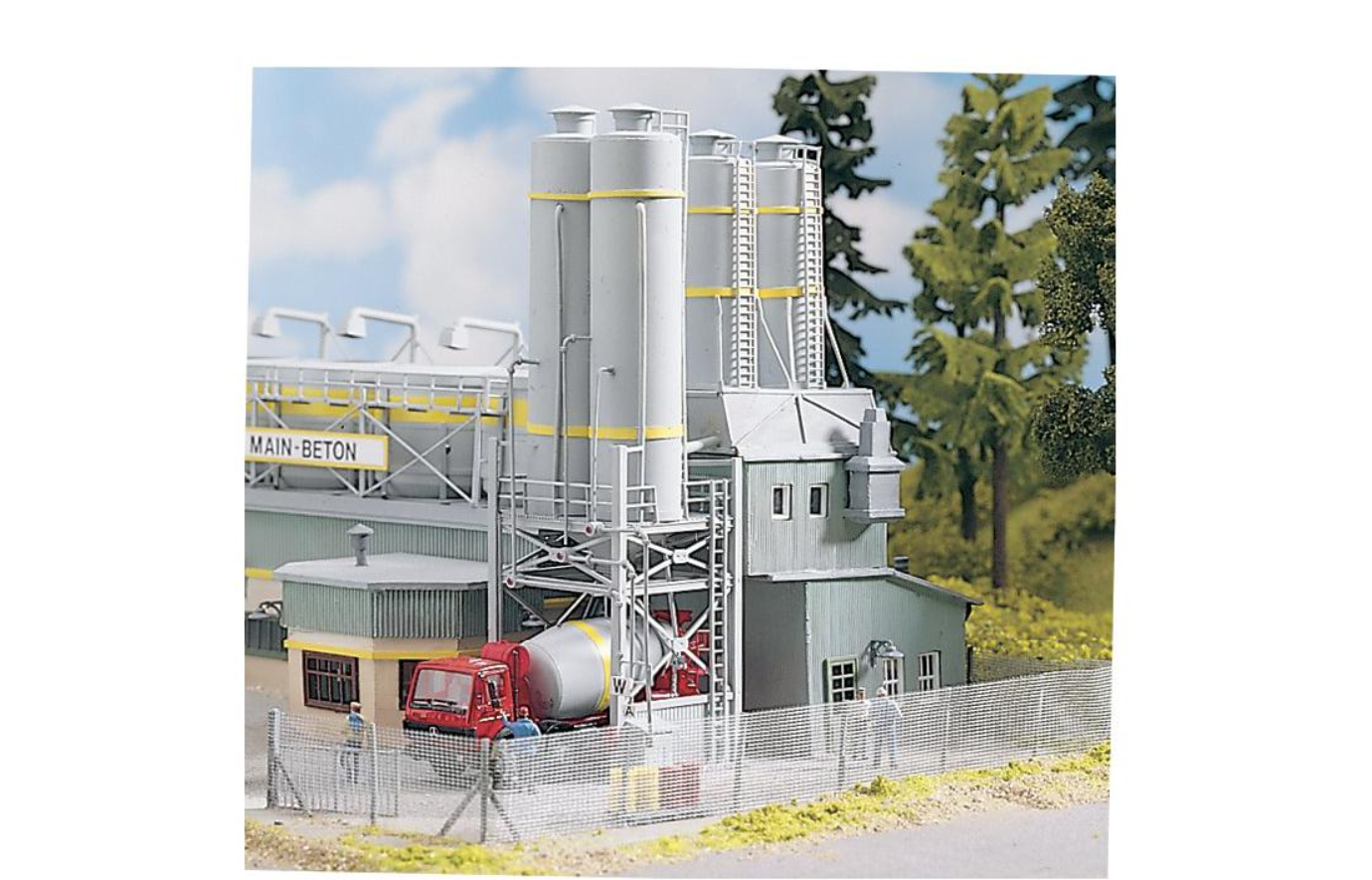 Das Ziel vieler Modellbahner: Endlich ein Betonwerk für die PIKO-Zementsilowagen! Mit dem H0-Bausatz nach dem Vor-bild der Firma Main-Beton geht dieser Wunsch in Erfüllung. In den Silos werden die verschiedenen Sorten an Fertigbeton gelagert. Sie können von dort mit den Mischfahrzeugen abgeholt werden.