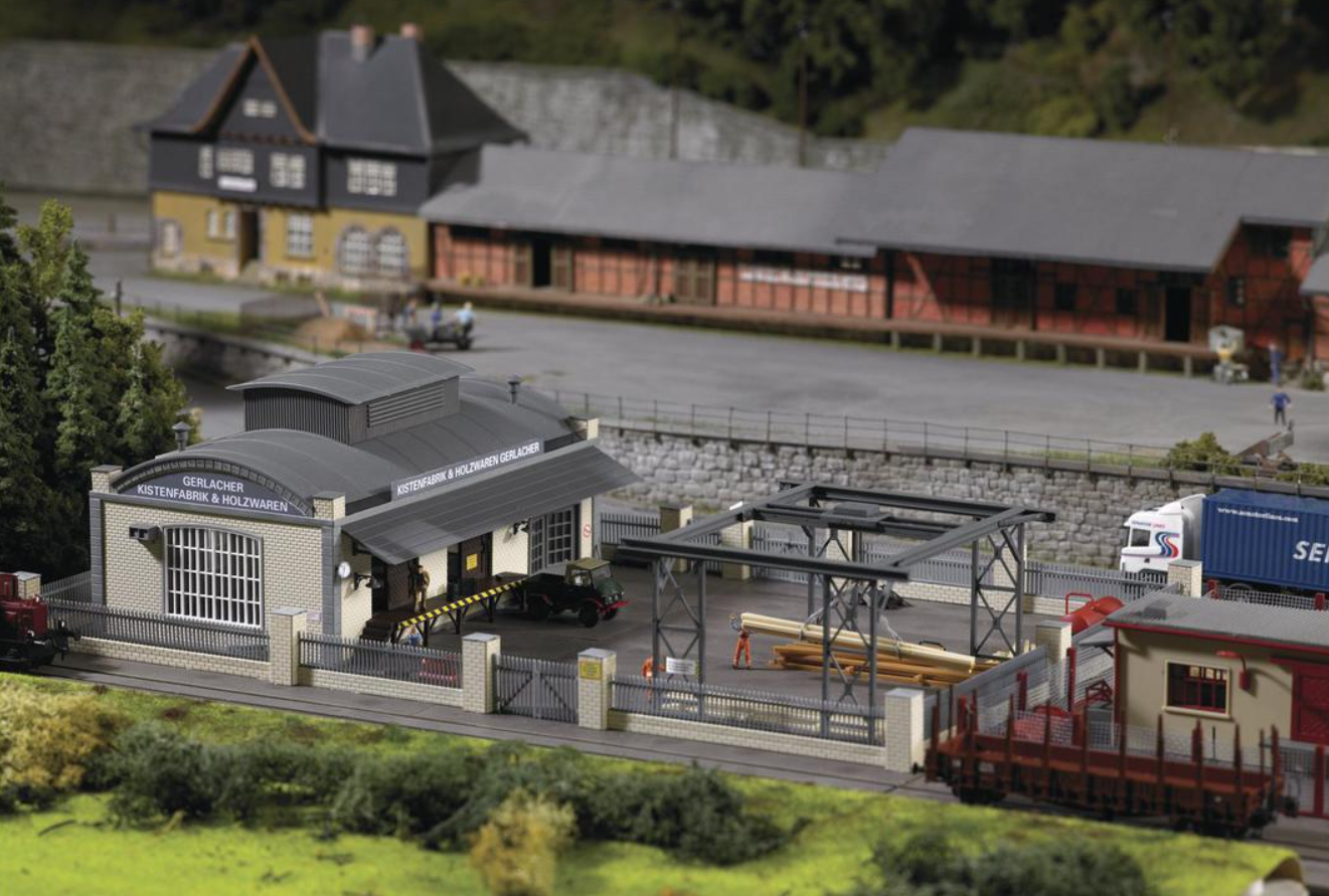 Dieses Industrie-Ensemble besteht aus einem kleinen Werksgebäude mit Tonnendach und einem Laufkran auf einer Bodenplatte.