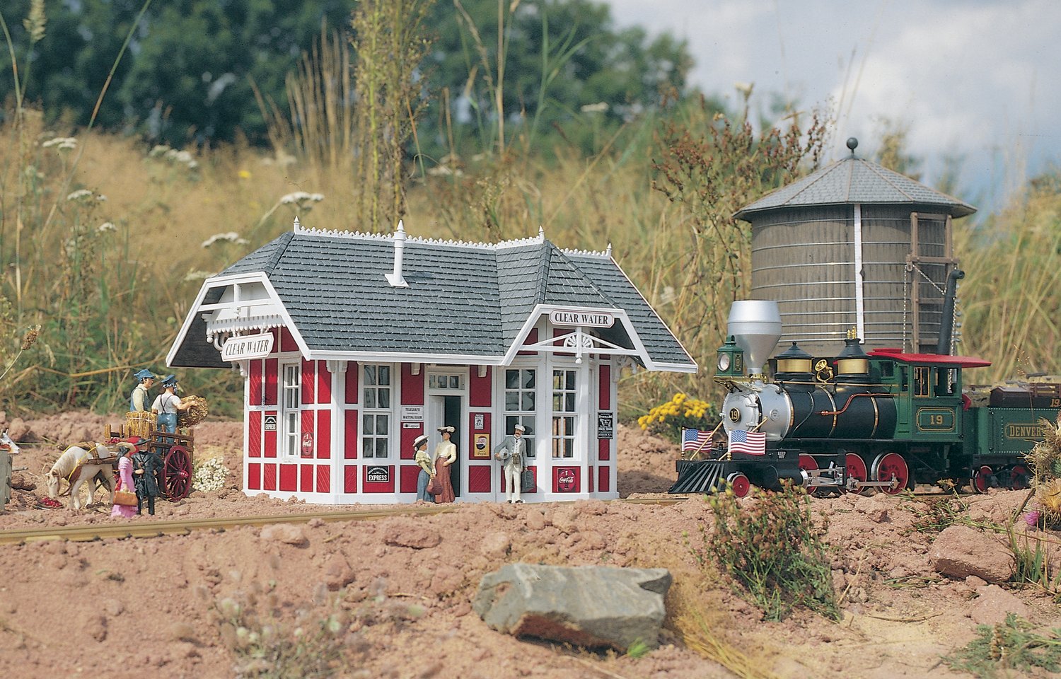 Um 1870 entstanden, präsentiert sich die Clear Water Station im typisch amerikanisch-viktorianischen Stil. Der wetterfeste Bausatz weist Alterungsspuren auf.Türen und Fenster lassen sich öffnen und schließen.