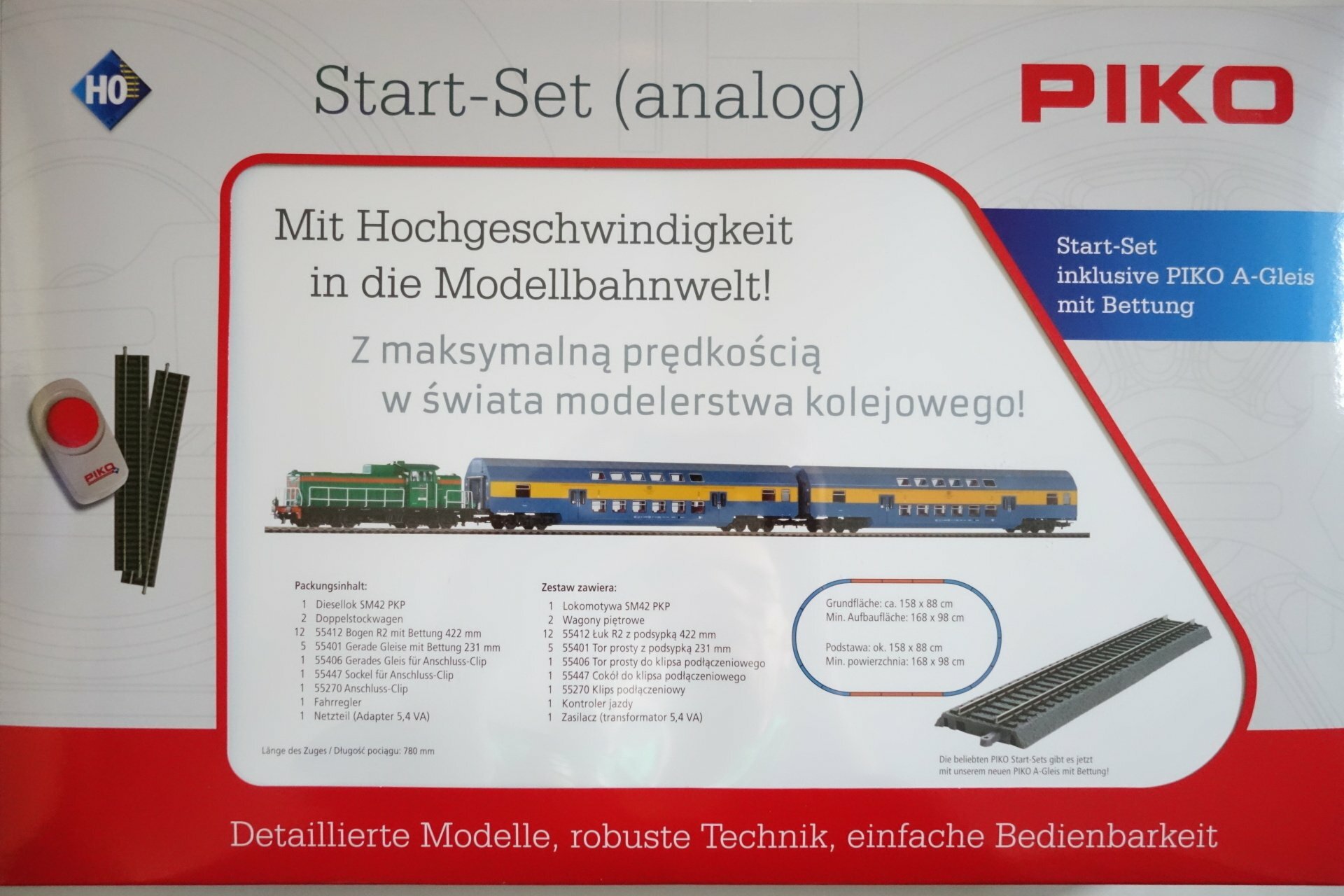 Das Set mit zwei Doppelstockwagen und der Diesellok SM42 Kociolek (Kessel) der PKP bildet einen typischen Personenzug auf einer nicht